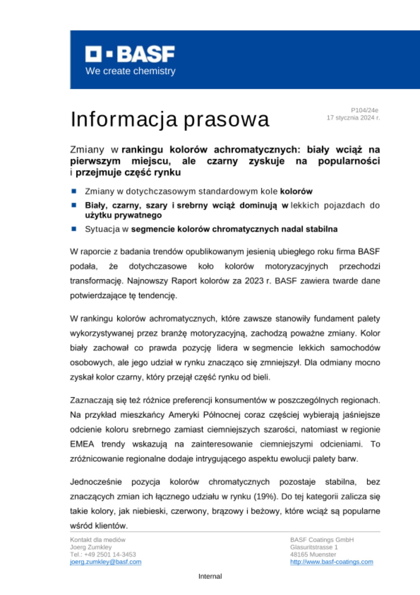 Raport BASF na temat fabrycznych kolorów w branży motoryzacyjnej (BASF Color Report for Automotive OEM Coatings) zawiera analizę zgromadzonych przez dział BASF Coatings danych dotyczących globalnej produkcji samochodów i stosowania lakierów w pojazdach kupowanych na użytek niekomercyjny w 2023 r.