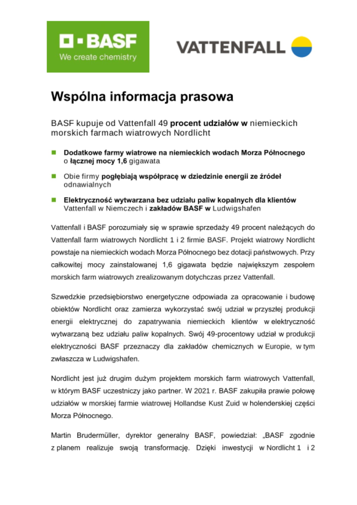 Martin Brudermüller, dyrektor generalny BASF, powiedział: „BASF zgodnie z planem realizuje swoją transformację. Dzięki inwestycji w Nordlicht 1 i 2 dysponujemy teraz odpowiednią ilością energii ze źródeł odnawialnych, aby wdrażać kolejne etapy tej transformacji w Europie, zwłaszcza w naszych największych zakładach w Ludwigshafen. Razem z naszym wieloletnim partnerem Vattenfall tworzymy warunki do osiągnięcia naszego wyznaczonego na 2030 rok celu redukcji emisji w zakresie 1 i 2 o 25 procent w porównaniu z 2018 rokiem”.