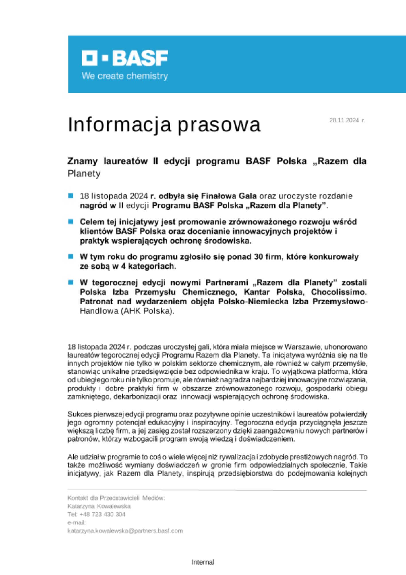 - 18 listopada 2024 r. odbyła się Finałowa Gala oraz uroczyste rozdanie nagród w II edycji Programu BASF Polska „Razem dla Planety”.