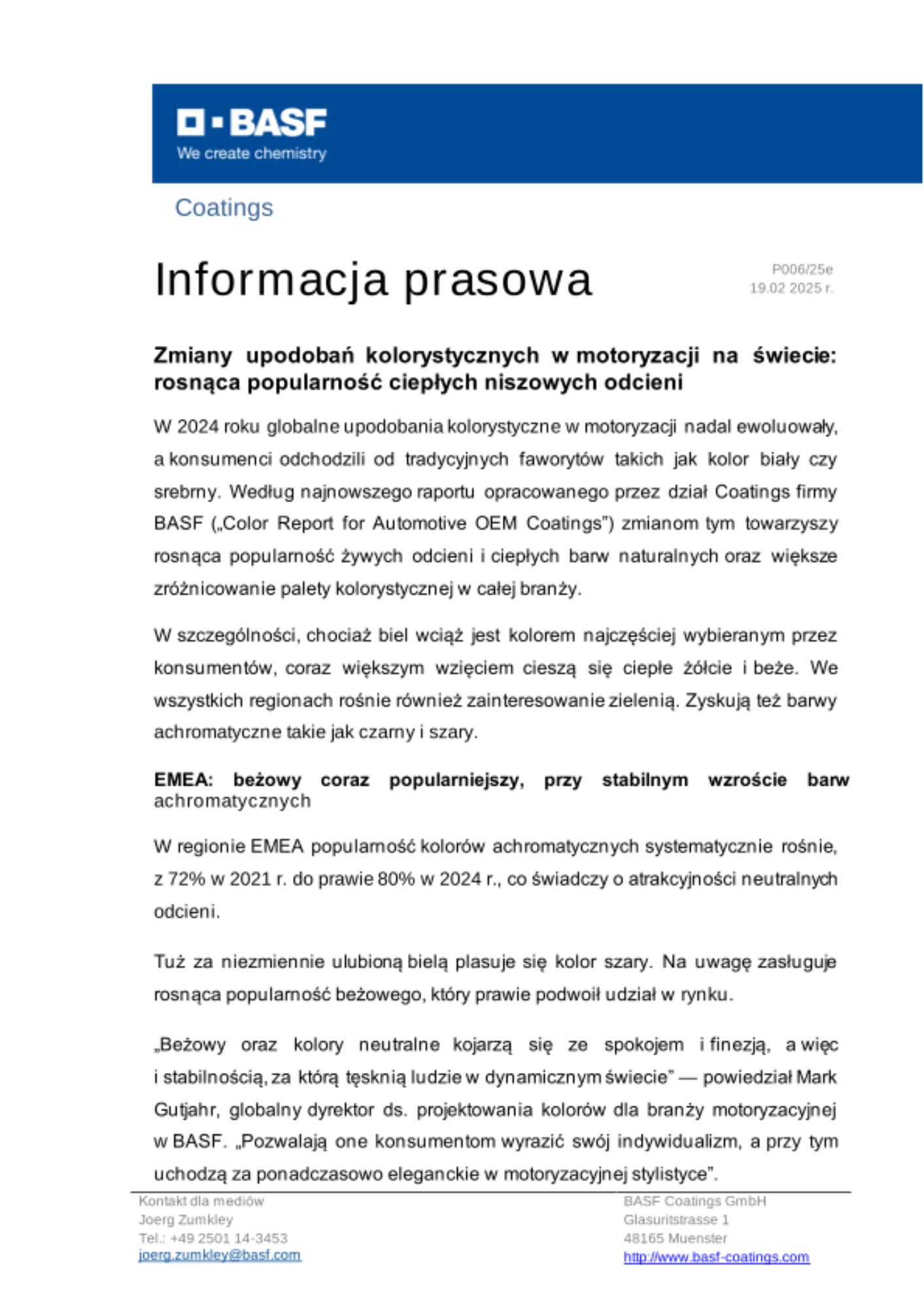 Dział Coatings firmy BASF jest światowym ekspertem w dziedzinie rozwoju, produkcji i sprzedaży innowacyjnych i zrównoważonych powłok samochodowych do zastosowań fabrycznych i renowacyjnych oraz lakierów dekoracyjnych, a także powłok nakładanych na powierzchnie metalowe, szklane i z tworzyw sztucznych, obsługującym wiele branż. Tworzymy zaawansowane, wydajne rozwiązania i oferujemy parametry, wzornictwo oraz nowe zastosowania mające zaspokoić potrzeby naszych partnerów na całym świecie. Firma BASF dzieli się swoimi umiejętnościami, wiedzą i zasobami światowych zespołów interdyscyplinarnych w ramach sieci współpracujących ze sobą zakładów zlokalizowanych w Europie, Ameryce Północnej, Ameryce Południowej oraz w regionie Azji i Pacyfiku. W 2023 r. dział Coatings firmy BASF odnotował globalne wpływy ze sprzedaży w wysokości ok. 4,4 mld EUR.