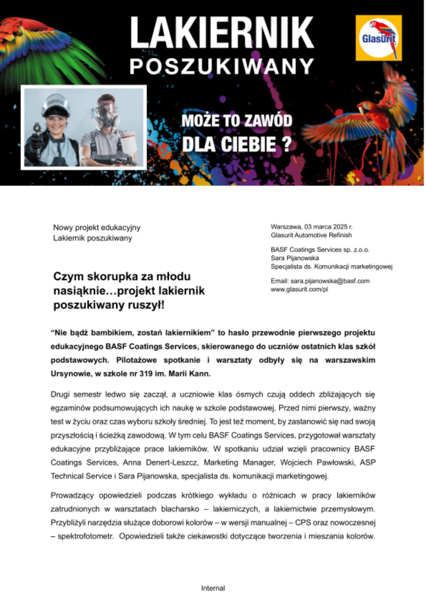 Szkoły podstawowe zainteresowane udziałem w naszym projekcie „Lakiernik poszukiwany” zachęcamy do kontaktu z nami poprzez wysłanie maila na adres: sara.pijanowska@basf.com.