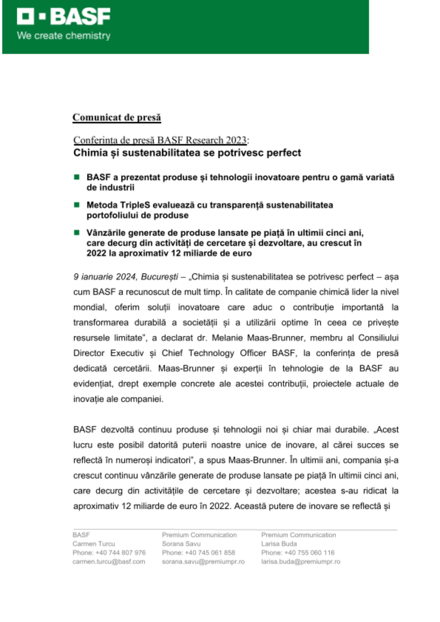 9 ianuarie 2024, București – „Chimia și sustenabilitatea se potrivesc perfect – așa cum BASF a recunoscut de mult timp. În calitate de companie chimică lider la nivel mondial, oferim soluții inovatoare care aduc o contribuție importantă la transformarea durabilă a societății și a utilizării optime în ceea ce privește resursele limitate”, a declarat dr. Melanie Maas-Brunner, membru al Consiliului Director Executiv și Chief Technology Officer BASF, la conferința de presă dedicată cercetării. Maas-Brunner și experții în tehnologie de la BASF au evidențiat, drept exemple concrete ale acestei contribuții, proiectele actuale de inovație ale companiei.