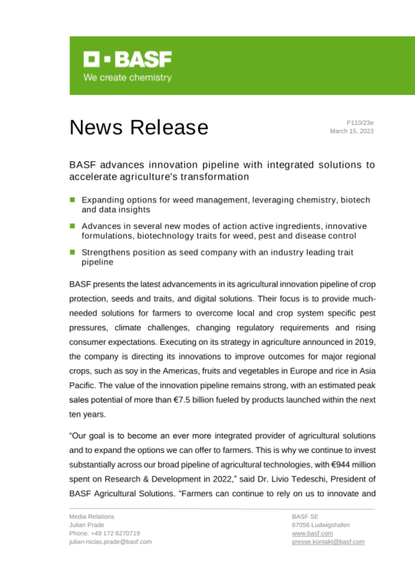 „Scopul nostru este să devenim, mai mult ca niciodată, un furnizor integrat de soluții pentru agricultură și să extindem opțiunile pe care le putem oferi fermierilor. Acesta este motivul pentru care continuăm să investim substanțial în gama noastră extinsă de tehnologii agricole, cu 944 de milioane de euro investiți în cercetare și dezvoltare, doar în 2022”, a declarat dr. Livio Tedeschi, președintele BASF Agricultural Solutions. „Fermierii pot continua să se bazeze pe noi în ceea ce privește furnizarea de noi substanțe active, formulări inovatoare și trăsături genetice, pentru a valorifica mai mult recoltele lor, atât din punct de vedere economic, cât și din punct de vedere al protecției mediului.”