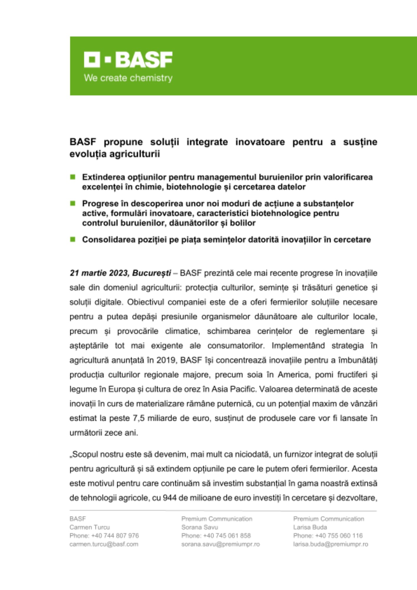 21 martie 2023, București – BASF prezintă cele mai recente progrese în inovațiile sale din domeniul agriculturii: protecția culturilor, semințe și trăsături genetice și soluții digitale. Obiectivul companiei este de a oferi fermierilor soluțiile necesare pentru a putea depăși presiunile organismelor dăunătoare ale culturilor locale, precum și provocările climatice, schimbarea cerințelor de reglementare și așteptările tot mai exigente ale consumatorilor. Implementând strategia în agricultură anunțată în 2019, BASF își concentrează inovațiile pentru a îmbunătăți producția culturilor regionale majore, precum soia în America, pomi fructiferi și legume în Europa și cultura de orez în Asia Pacific. Valoarea determinată de aceste inovații în curs de materializare rămâne puternică, cu un potențial maxim de vânzări estimat la peste 7,5 miliarde de euro, susținut de produsele care vor fi lansate în următorii zece ani.