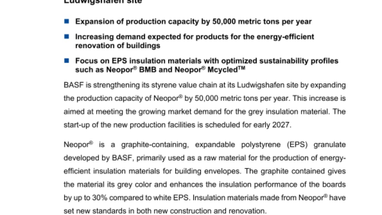 11 decembrie 2024, București – BASF întărește lanțul valoric al stirenului la locația sa din Ludwigshafen prin suplimentarea capacității de producție a Neopor® cu 50.000 de tone metrice pe an. Această expansiune are ca scop satisfacerea cererii în creștere a pieței pentru materialul de izolare de culoare gri. Punerea în funcțiune a noilor unități de producție este programată pentru începutul anului 2027.