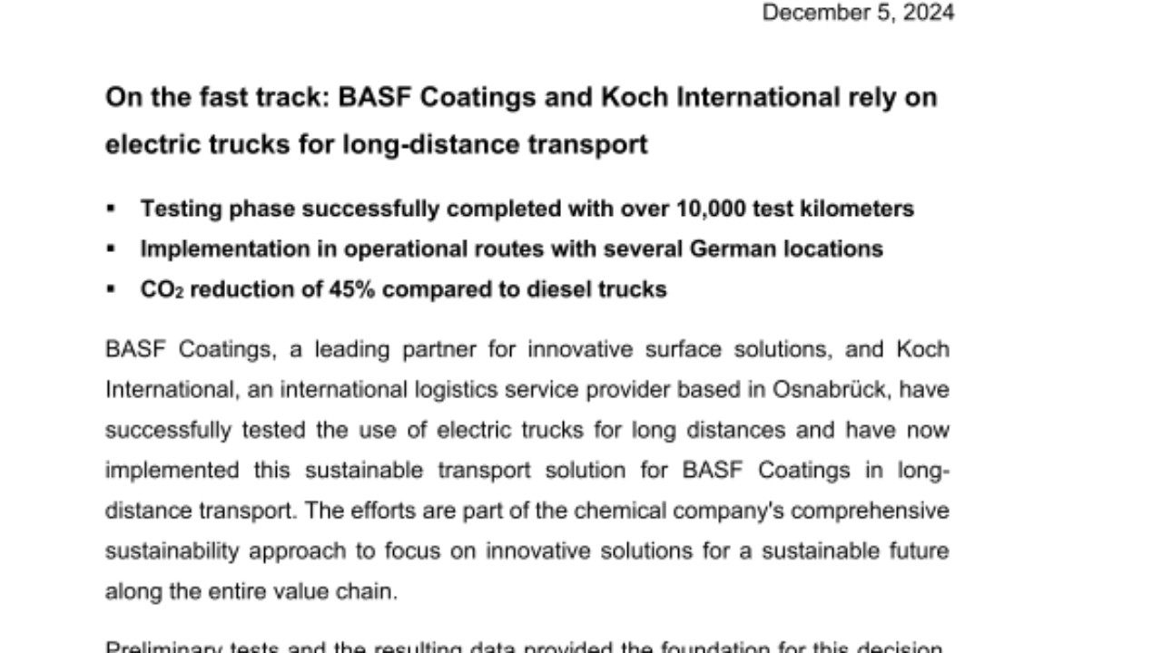 15 ianuarie 2025, București – BASF Coatings, un partener principal pentru soluții inovatoare pentru acoperirea suprafețelor, și Koch International, un furnizor internațional de servicii logistice cu sediul în Osnabrück, au testat cu succes utilizarea camioanelor electrice în cazul transporturilor pe distanțe lungi și au implementat această soluție de transport durabil pentru BASF Coatings. Această măsură face parte din strategia amplă a companiei chimice privind sustenabilitatea, care pune accent pe soluții inovatoare pentru un viitor durabil pe întregul lanț valoric.