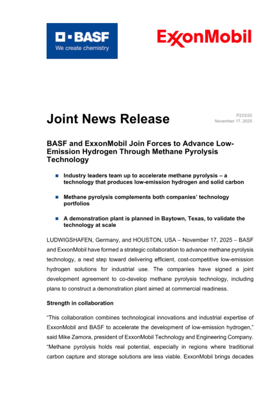 „Această colaborare reunește inovațiile tehnologice și expertiza industrială ale ExxonMobil și BASF pentru a accelera dezvoltarea hidrogenului cu emisii reduse”, a declarat Mike Zamora, președinte al ExxonMobil Technology and Engineering Company. „Piroliza metanului are un potențial real, în special în regiunile în care soluțiile tradiționale de captare și stocare a carbonului sunt mai puțin fezabile. ExxonMobil contribuie cu decenii de cunoștințe tehnice aprofundate în piroliza metanului și cu un angajament comun pentru inovație.”