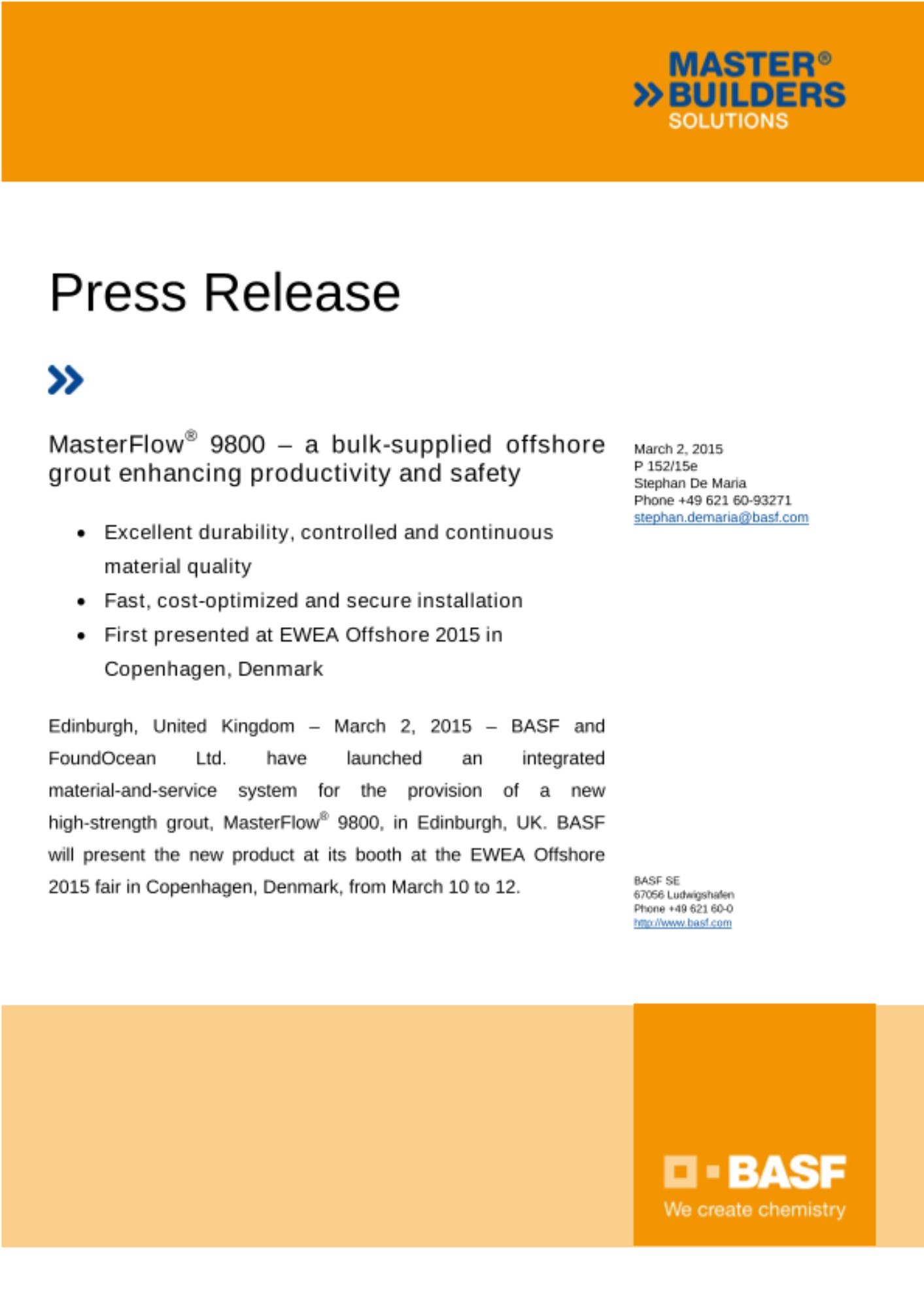 Edinburgh, United Kingdom – March 2, 2015 – BASF and FoundOcean Ltd. have launched an integrated material‑and‑service system for the provision of a new high‑strength grout, MasterFlow® 9800, in Edinburgh, UK. BASF will present the new product at its booth at the EWEA Offshore 2015 fair in Copenhagen, Denmark, from March 10 to 12.