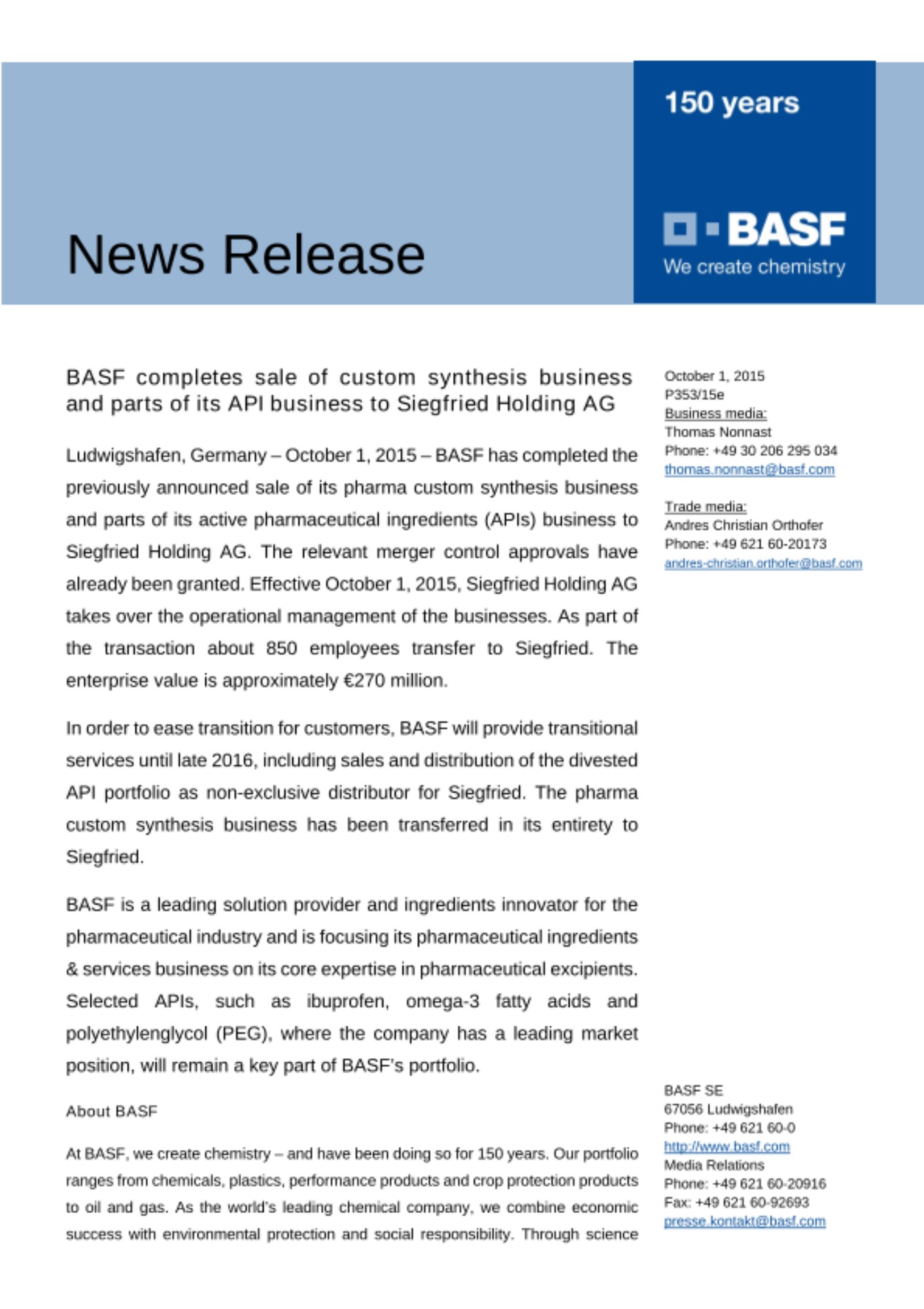 Ludwigshafen, Germany – October 1, 2015 – BASF has completed the previously announced sale of its pharma custom synthesis business and parts of its active pharmaceutical ingredients (APIs) business to Siegfried Holding AG. The relevant merger control approvals have already been granted. Effective October 1, 2015, Siegfried Holding AG takes over the operational management of the businesses. As part of the transaction about 850 employees transfer to Siegfried. The enterprise value is approximately €270 million.