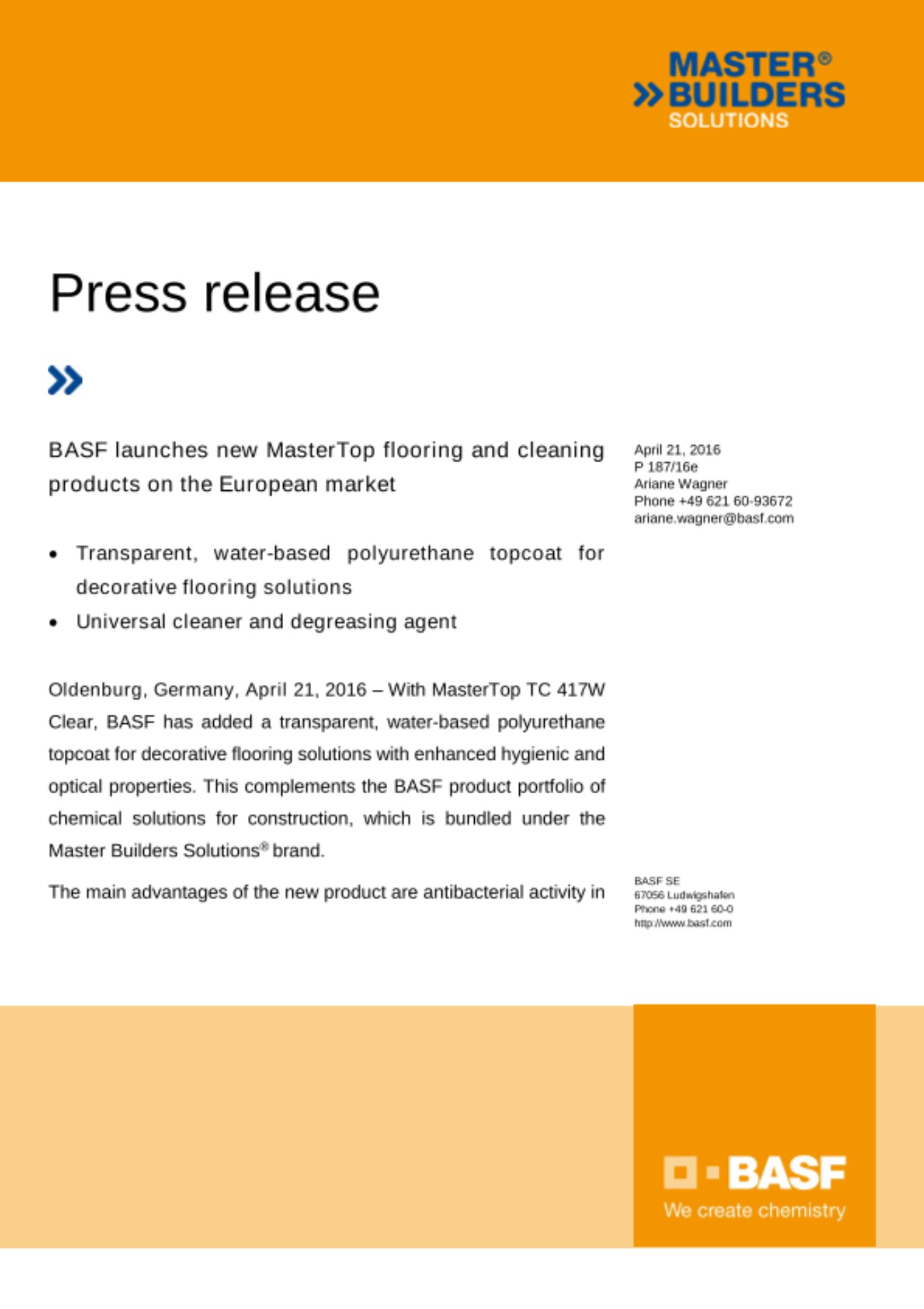 Oldenburg, Germany, April 21, 2016 – With MasterTop TC 417W Clear, BASF has added a transparent, water-based polyurethane topcoat for decorative flooring solutions with enhanced hygienic and optical properties. This complements the BASF product portfolio of chemical solutions for construction, which is bundled under the Master Builders Solutions® brand.