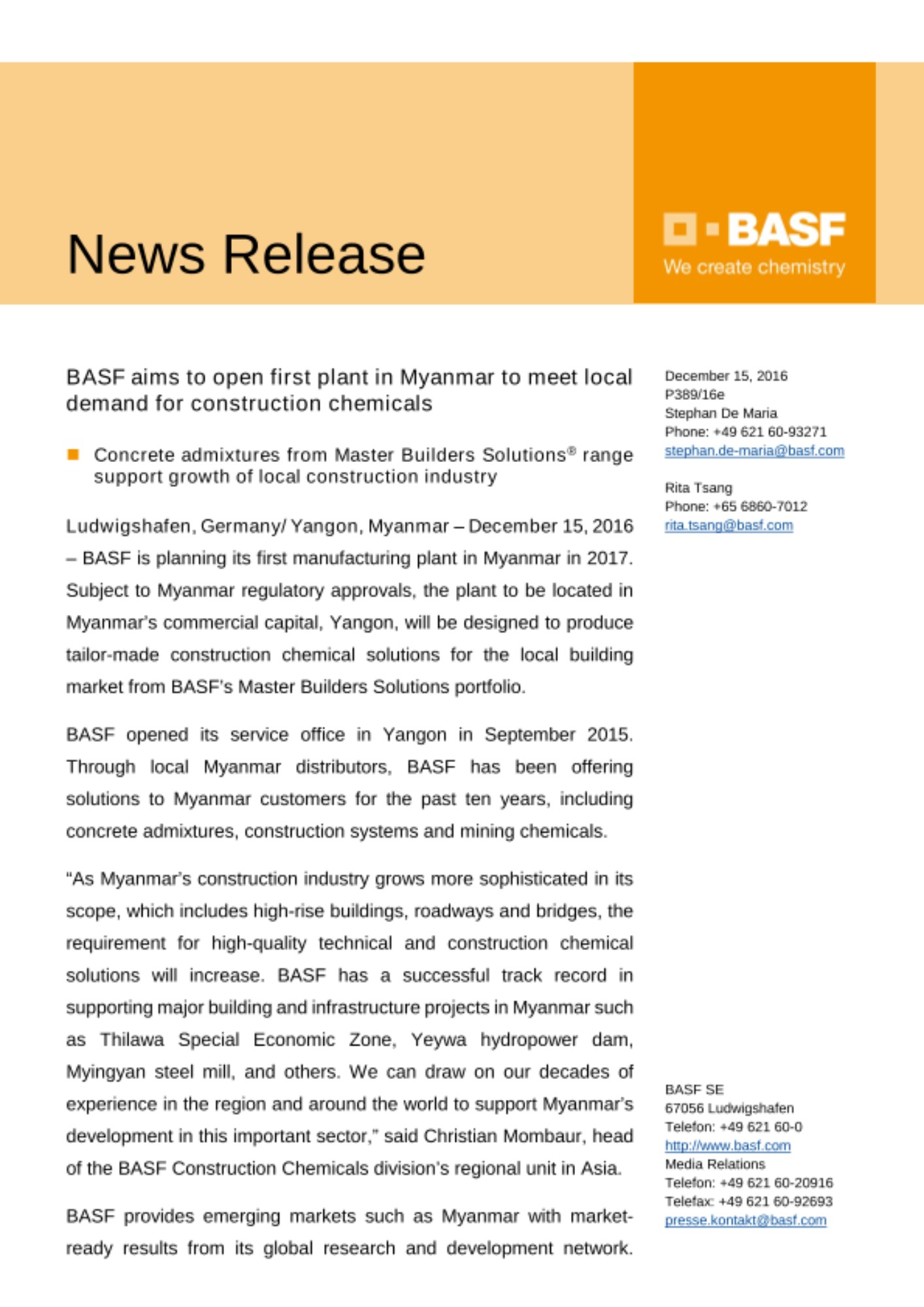 Ludwigshafen, Germany/ Yangon, Myanmar – December 15, 2016 – BASF is planning its first manufacturing plant in Myanmar in 2017. Subject to Myanmar regulatory approvals, the plant to be located in Myanmar’s commercial capital, Yangon, will be designed to produce tailor-made construction chemical solutions for the local building market from BASF’s Master Builders Solutions portfolio.