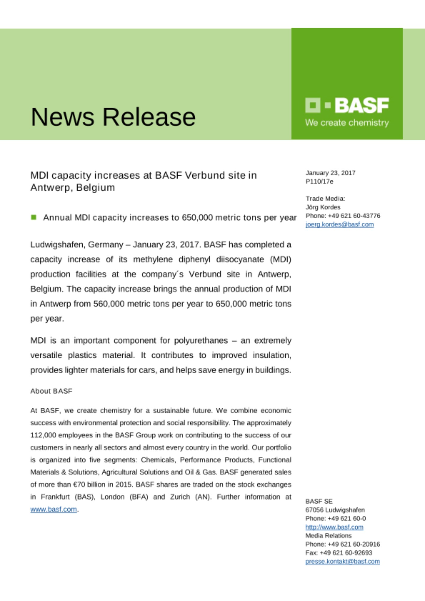 Ludwigshafen, Germany – January 23, 2017. BASF has completed a capacity increase of its methylene diphenyl diisocyanate (MDI) production facilities at the company´s Verbund site in Antwerp, Belgium. The capacity increase brings the annual production of MDI in Antwerp from 560,000 metric tons per year to 650,000 metric tons per year.