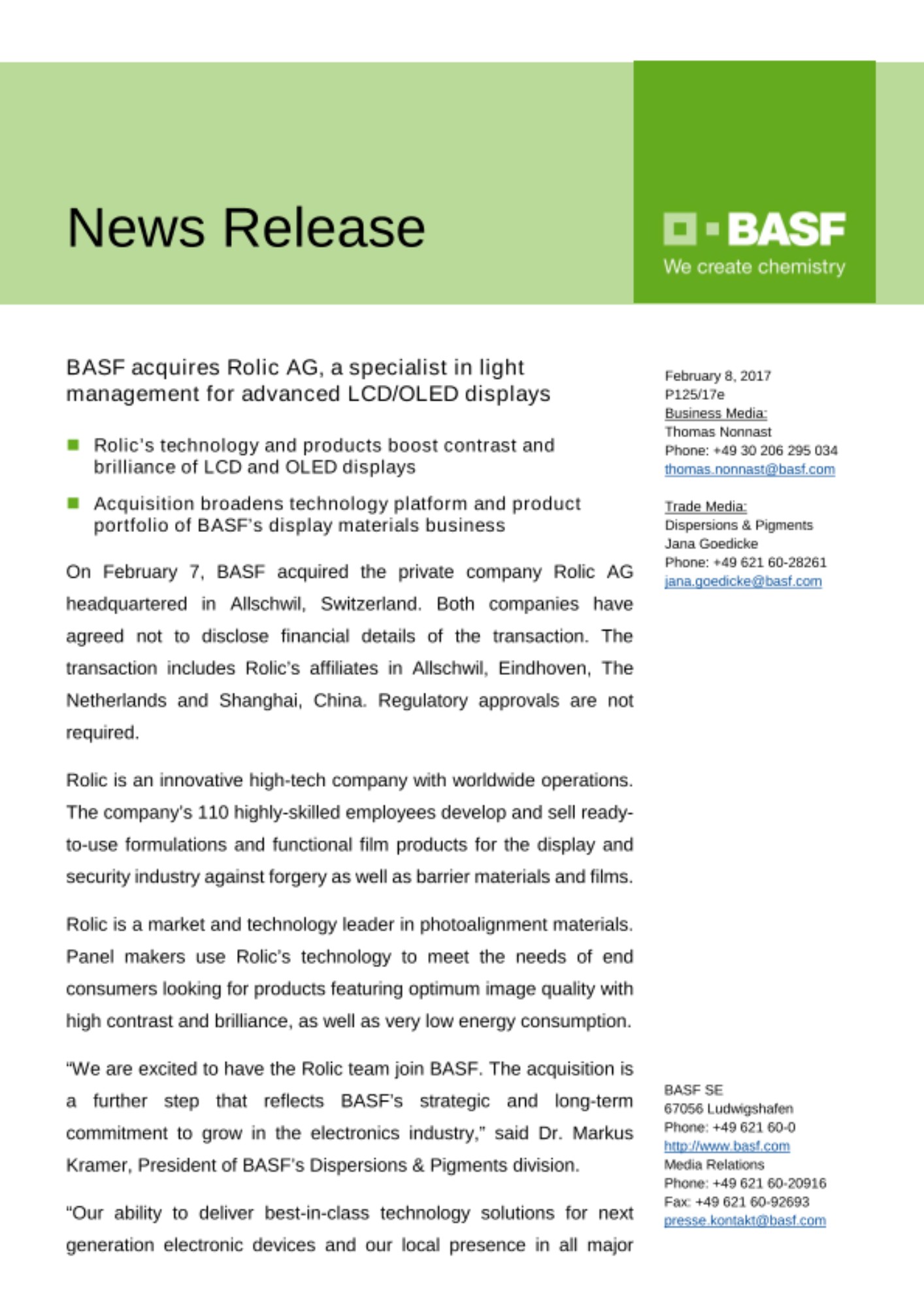On February 7, BASF acquired the private company Rolic AG headquartered in Allschwil, Switzerland. Both companies have agreed not to disclose financial details of the transaction. The transaction includes Rolic’s affiliates in Allschwil, Eindhoven, The Netherlands and Shanghai, China. Regulatory approvals are not required.