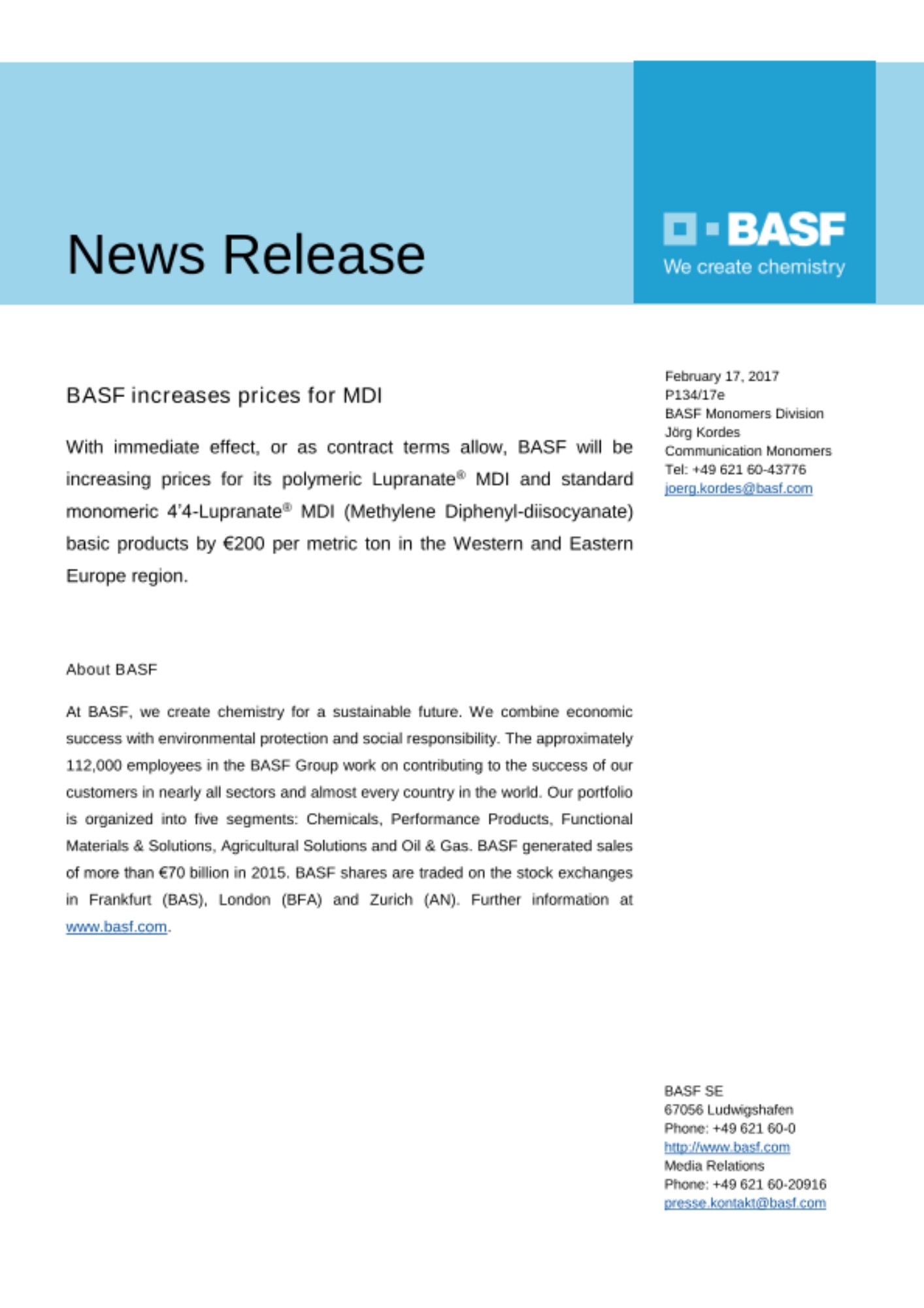 With immediate effect, or as contract terms allow, BASF will be increasing prices for its polymeric Lupranate® MDI and standard monomeric 4’4-Lupranate® MDI (Methylene Diphenyl-diisocyanate) basic products by €200 per metric ton in the Western and Eastern Europe region.