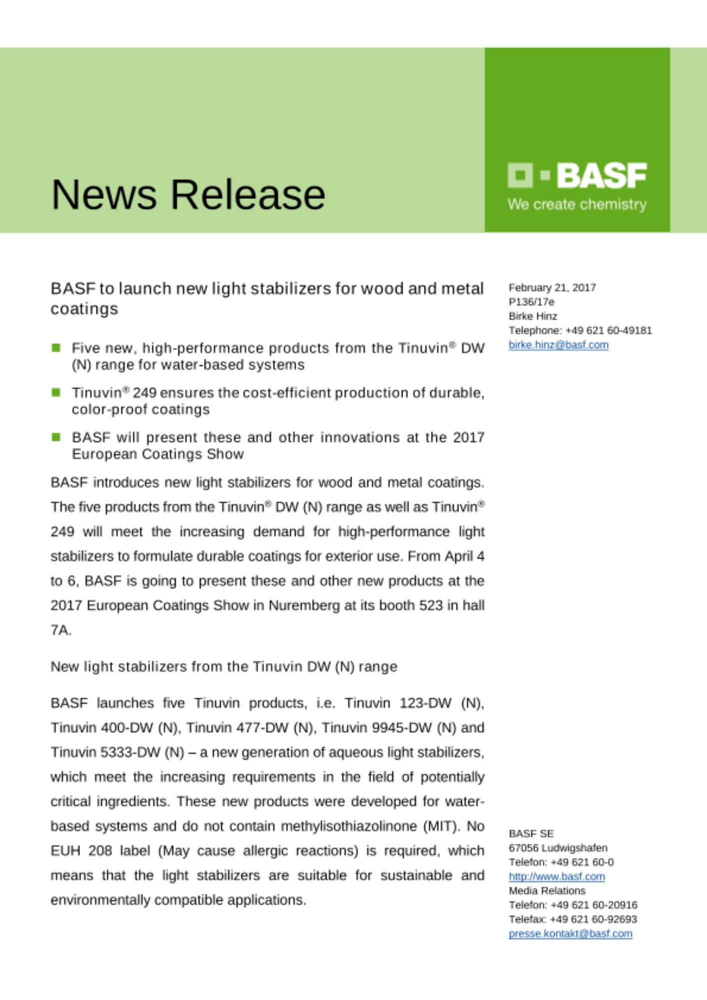 BASF launches five Tinuvin products, i.e. Tinuvin 123-DW (N), Tinuvin 400-DW (N), Tinuvin 477-DW (N), Tinuvin 9945-DW (N) and Tinuvin 5333-DW (N) – a new generation of aqueous light stabilizers, which meet the increasing requirements in the field of potentially critical ingredients. These new products were developed for water-based systems and do not contain methylisothiazolinone (MIT). No EUH 208 label (May cause allergic reactions) is required, which means that the light stabilizers are suitable for sustainable and environmentally compatible applications.