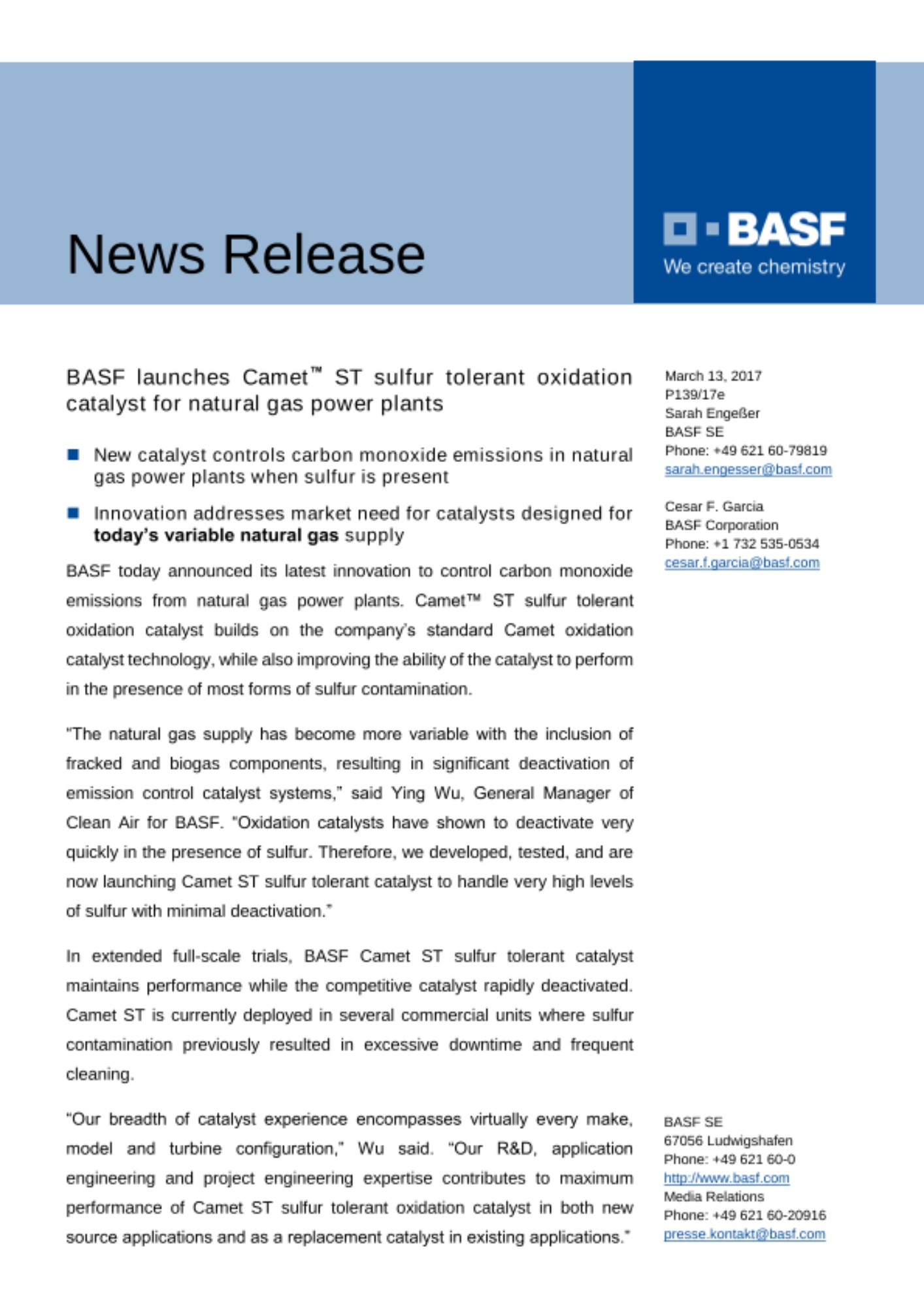 BASF today announced its latest innovation to control carbon monoxide emissions from natural gas power plants. Camet™ ST sulfur tolerant oxidation catalyst builds on the company’s standard Camet oxidation catalyst technology, while also improving the ability of the catalyst to perform in the presence of most forms of sulfur contamination.