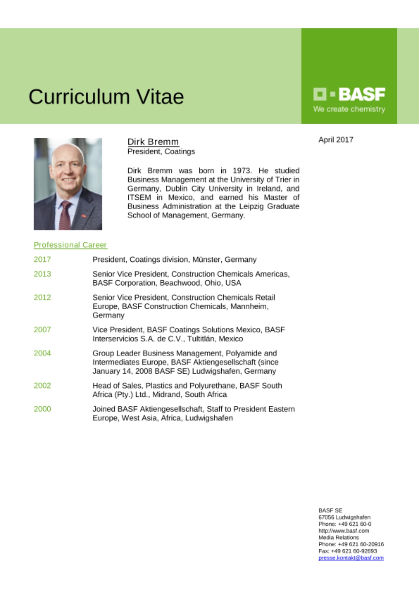 Bremm earned his Master’s Degree in Business Administration at the Leipzig Graduate School of Management in Leipzig, Germany. He joined BASF in 2000 in Ludwigshafen, Germany. After holding different positions in various segments of BASF Group – including head of Business Management Polyamide and Intermediates Europe in Ludwigshafen, and vice president of BASF Coatings Solutions in Tultitlán, Mexico – Bremm served as senior vice president for Construction Chemicals Americas in Beachwood, Ohio, USA.
