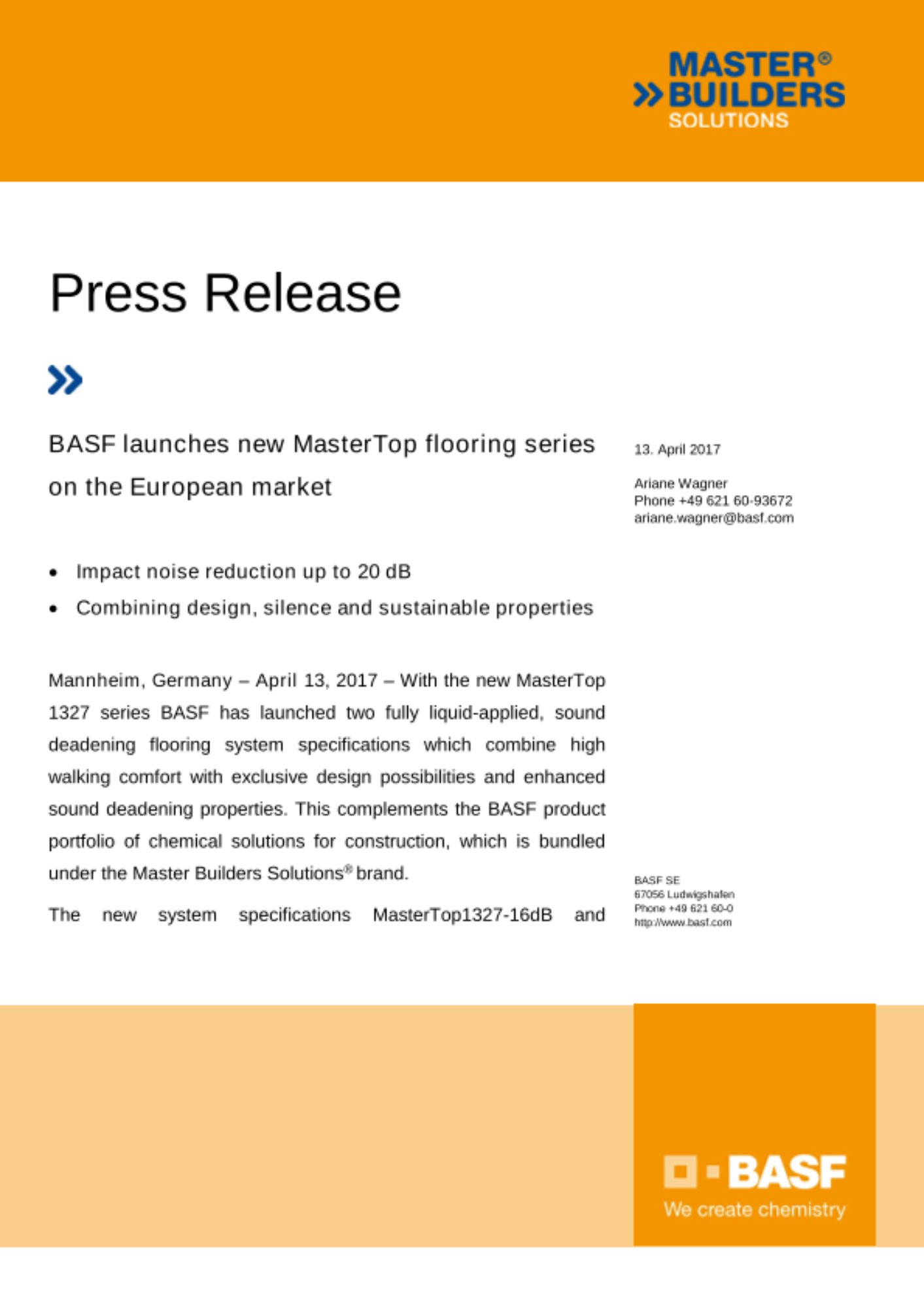 Mannheim, Germany – April 13, 2017 – With the new MasterTop 1327 series BASF has launched two fully liquid-applied, sound deadening flooring system specifications which combine high walking comfort with exclusive design possibilities and enhanced sound deadening properties. This complements the BASF product portfolio of chemical solutions for construction, which is bundled under the Master Builders Solutions® brand.
