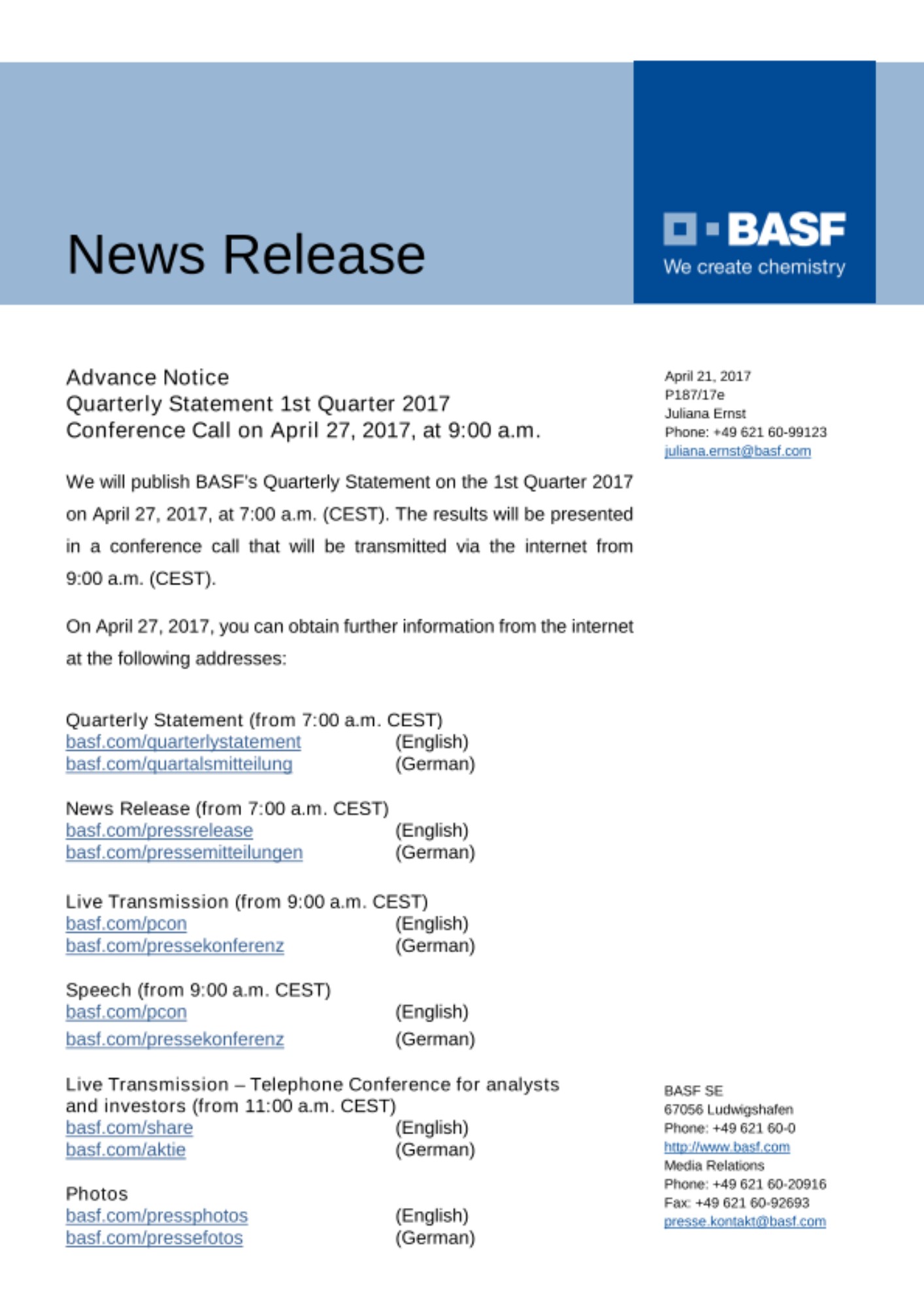 We will publish BASF’s Quarterly Statement on the 1st Quarter 2017 on April 27, 2017, at 7:00 a.m. (CEST). The results will be presented in a conference call that will be transmitted via the internet from 9:00 a.m. (CEST).