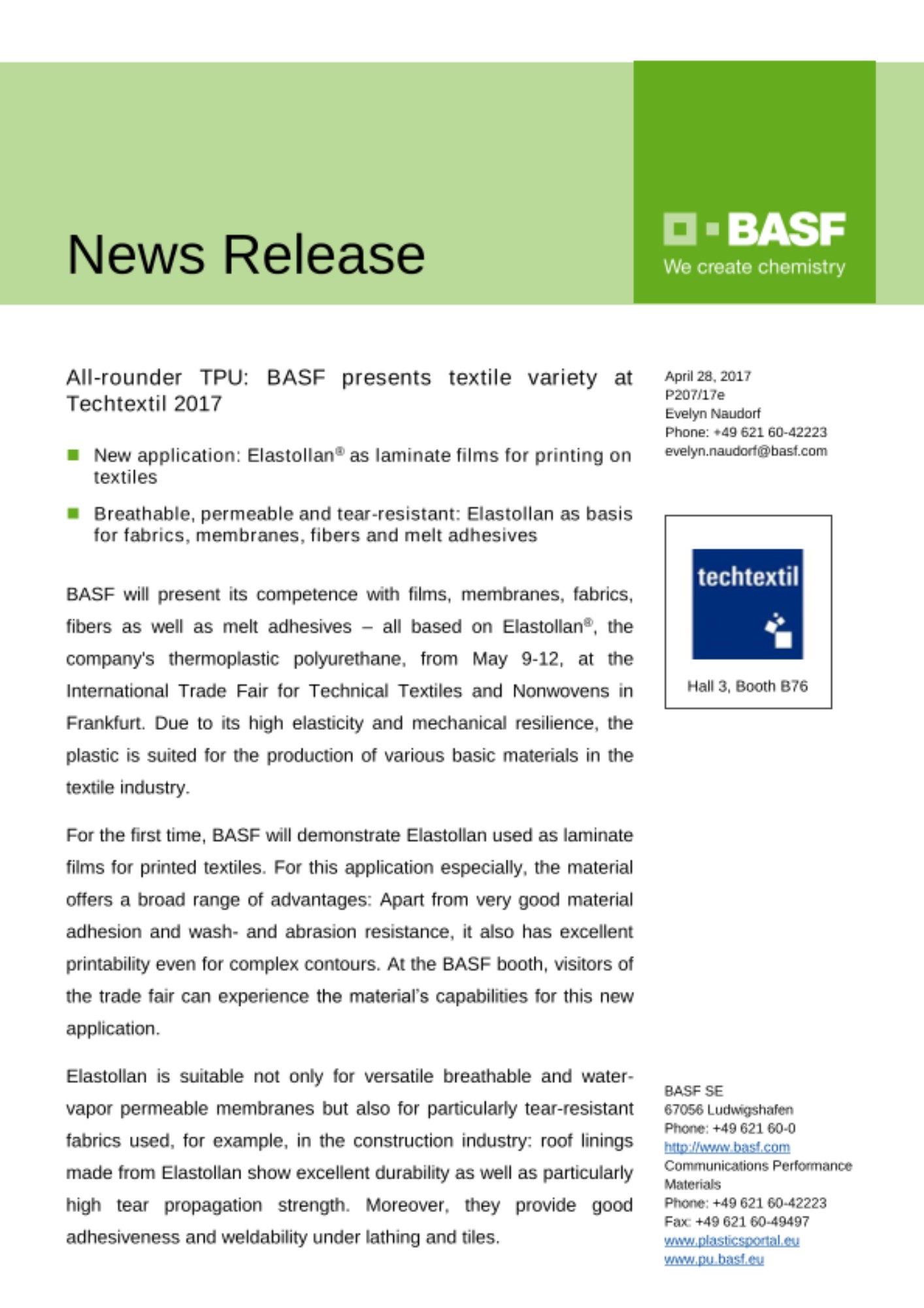 BASF will present its competence with films, membranes, fabrics, fibers as well as melt adhesives – all based on Elastollan®, the company's thermoplastic polyurethane, from May 9-12, at the International Trade Fair for Technical Textiles and Nonwovens in Frankfurt. Due to its high elasticity and mechanical resilience, the plastic is suited for the production of various basic materials in the textile industry.