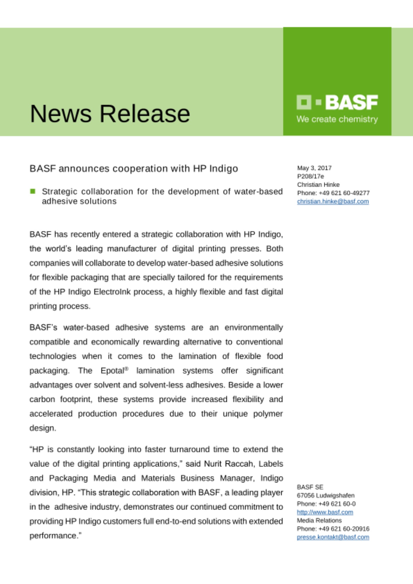 BASF has recently entered a strategic collaboration with HP Indigo, the world’s leading manufacturer of digital printing presses. Both companies will collaborate to develop water-based adhesive solutions for flexible packaging that are specially tailored for the requirements of the HP Indigo ElectroInk process, a highly flexible and fast digital printing process.
