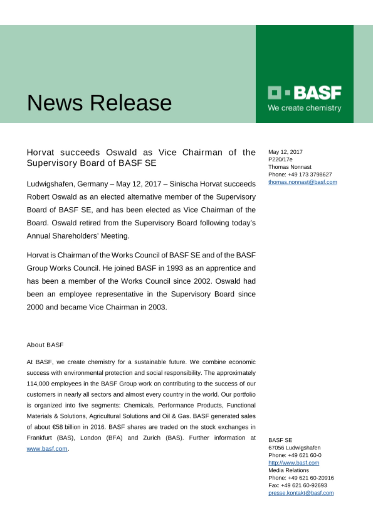 Ludwigshafen, Germany – May 12, 2017 – Sinischa Horvat succeeds Robert Oswald as an elected alternative member of the Supervisory Board of BASF SE, and has been elected as Vice Chairman of the Board. Oswald retired from the Supervisory Board following today’s Annual Shareholders’ Meeting.