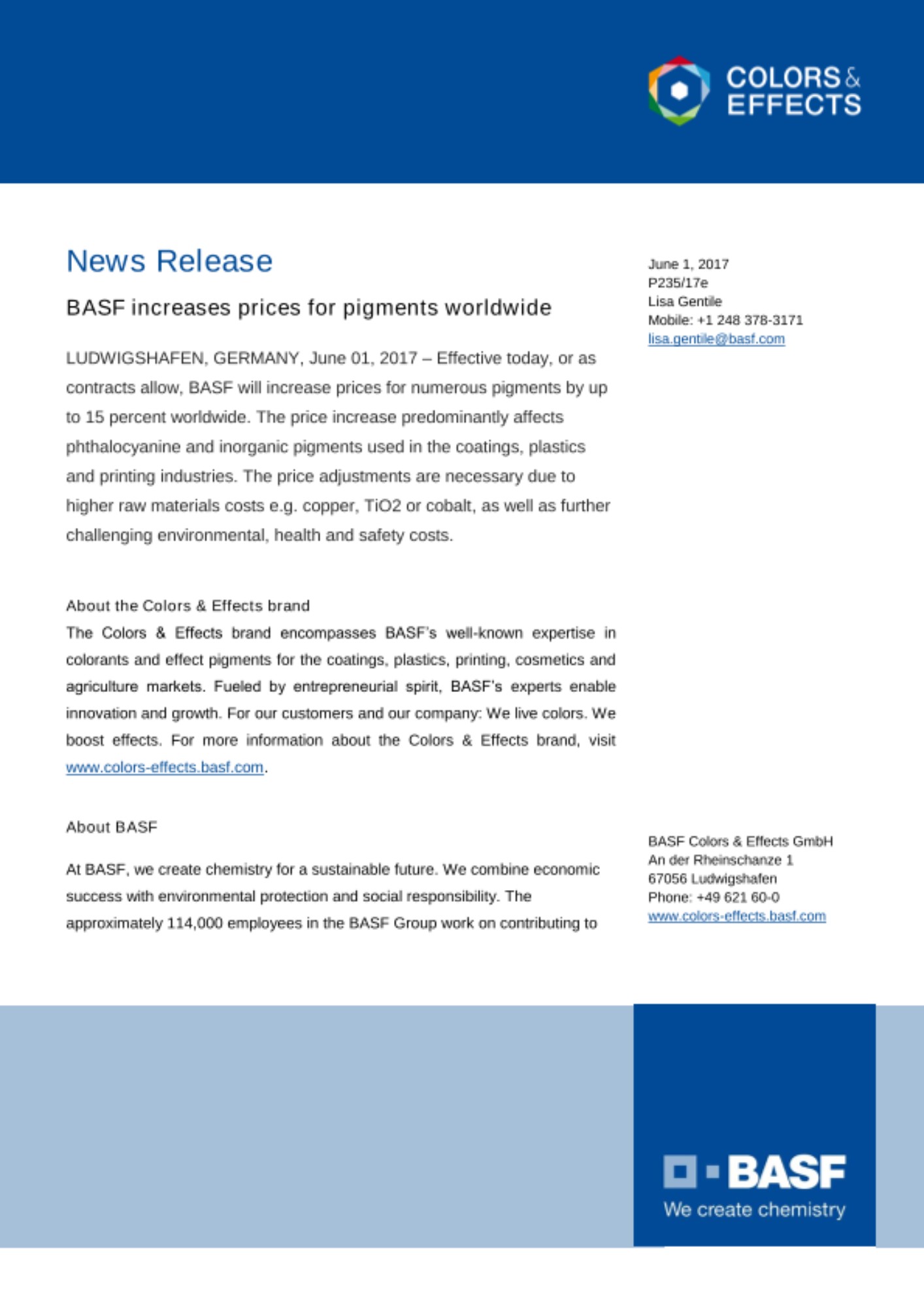 LUDWIGSHAFEN, GERMANY, June 01, 2017 – Effective today, or as contracts allow, BASF will increase prices for numerous pigments by up to 15 percent worldwide. The price increase predominantly affects phthalocyanine and inorganic pigments used in the coatings, plastics and printing industries. The price adjustments are necessary due to higher raw materials costs e.g. copper, TiO2 or cobalt, as well as further challenging environmental, health and safety costs.