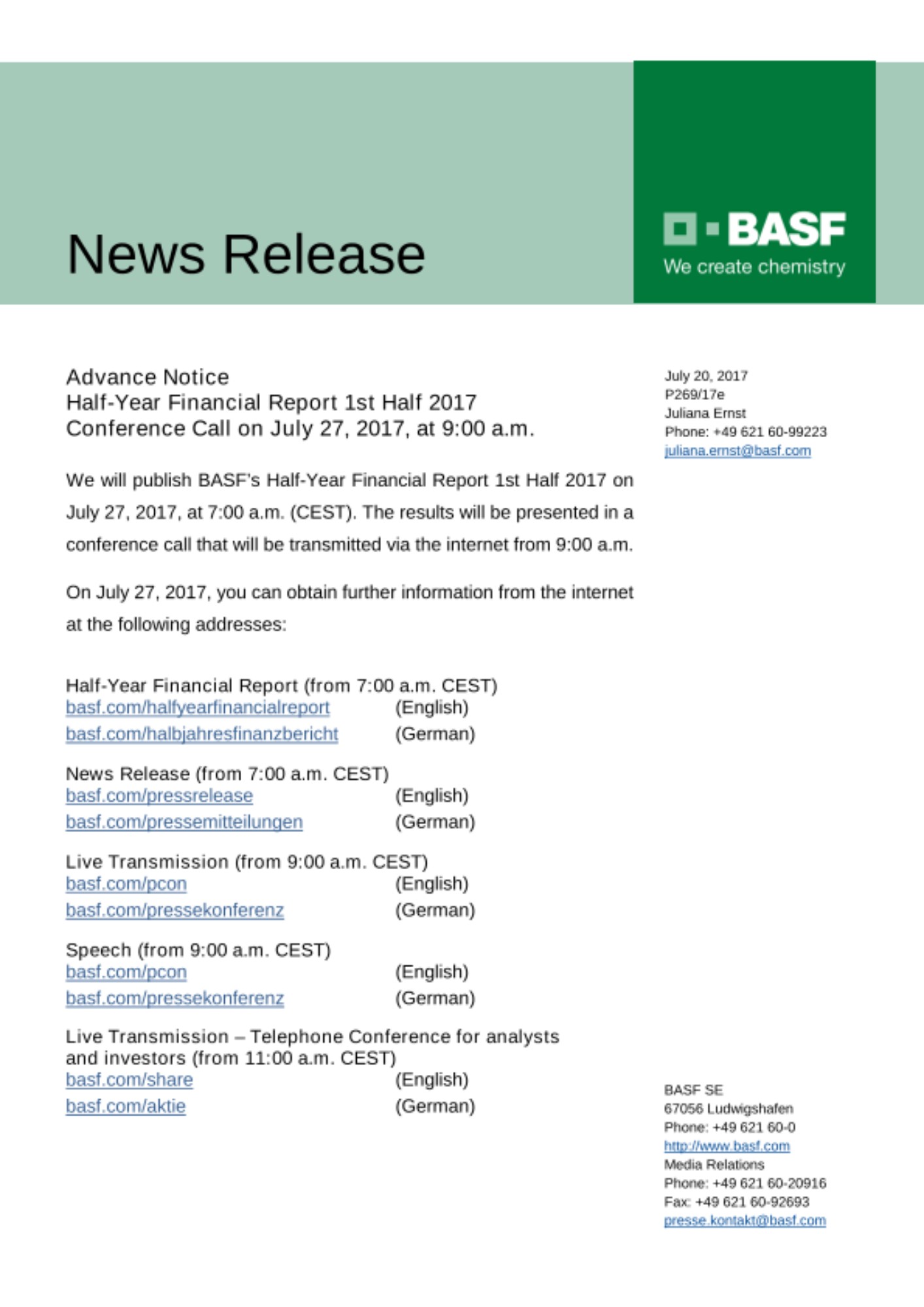 We will publish BASF’s Half-Year Financial Report 1st Half 2017 on July 27, 2017, at 7:00 a.m. (CEST). The results will be presented in a conference call that will be transmitted via the internet from 9:00 a.m.