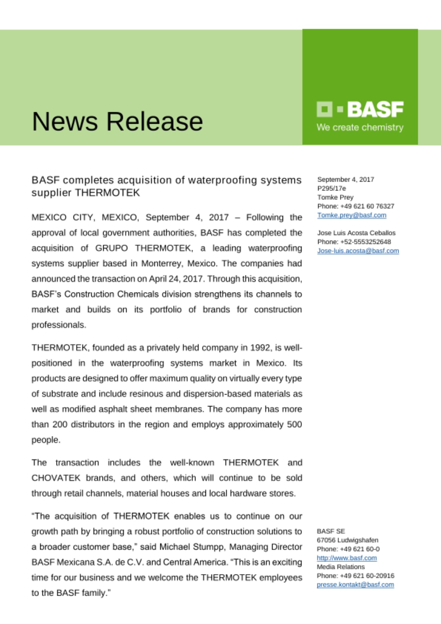 MEXICO CITY, MEXICO, September 4, 2017 – Following the approval of local government authorities, BASF has completed the acquisition of GRUPO THERMOTEK, a leading waterproofing systems supplier based in Monterrey, Mexico. The companies had announced the transaction on April 24, 2017. Through this acquisition, BASF’s Construction Chemicals division strengthens its channels to market and builds on its portfolio of brands for construction professionals.