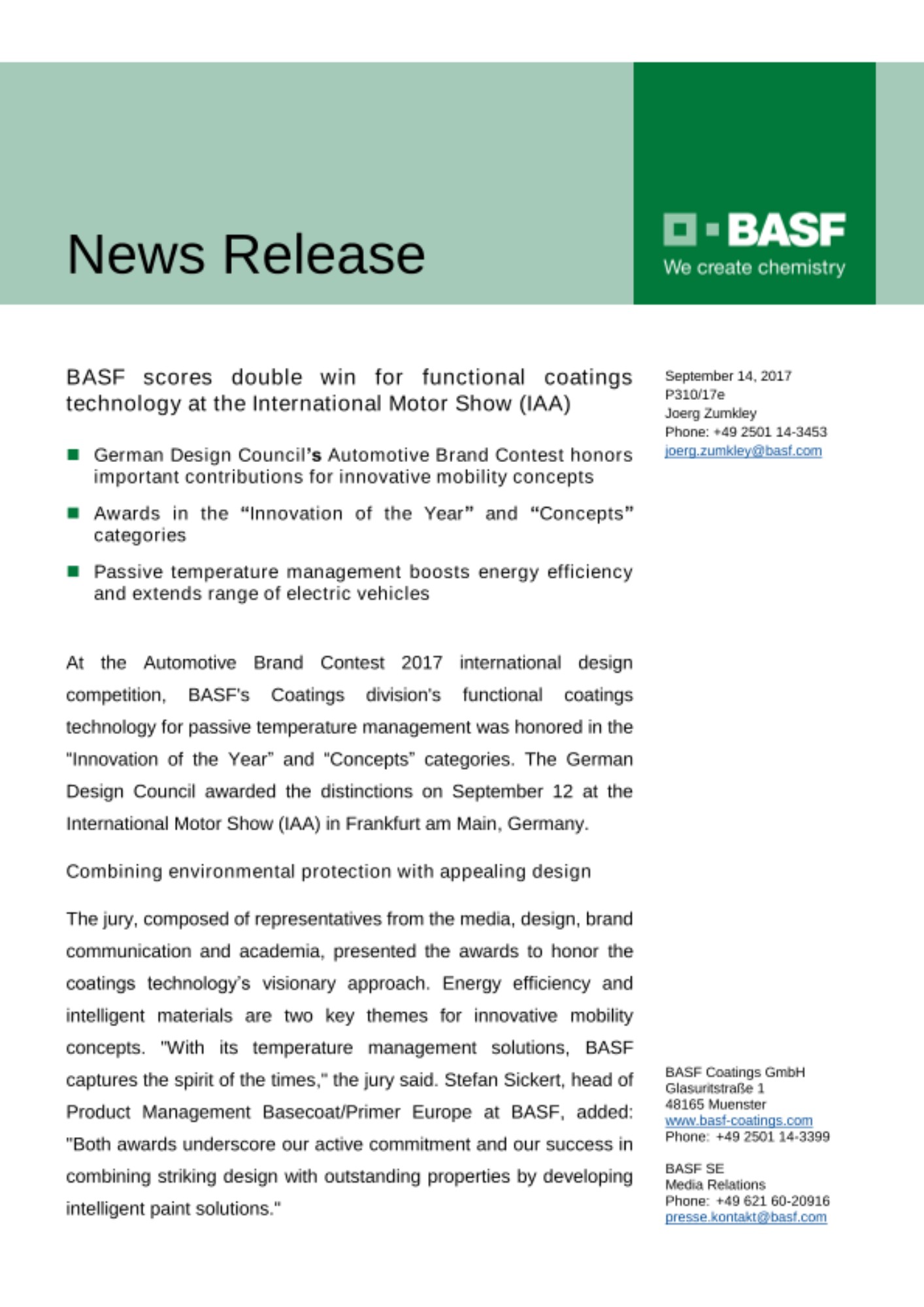 At the Automotive Brand Contest 2017 international design competition, BASF's Coatings division's functional coatings technology for passive temperature management was honored in the “Innovation of the Year” and “Concepts” categories. The German Design Council awarded the distinctions on September 12 at the International Motor Show (IAA) in Frankfurt am Main, Germany.