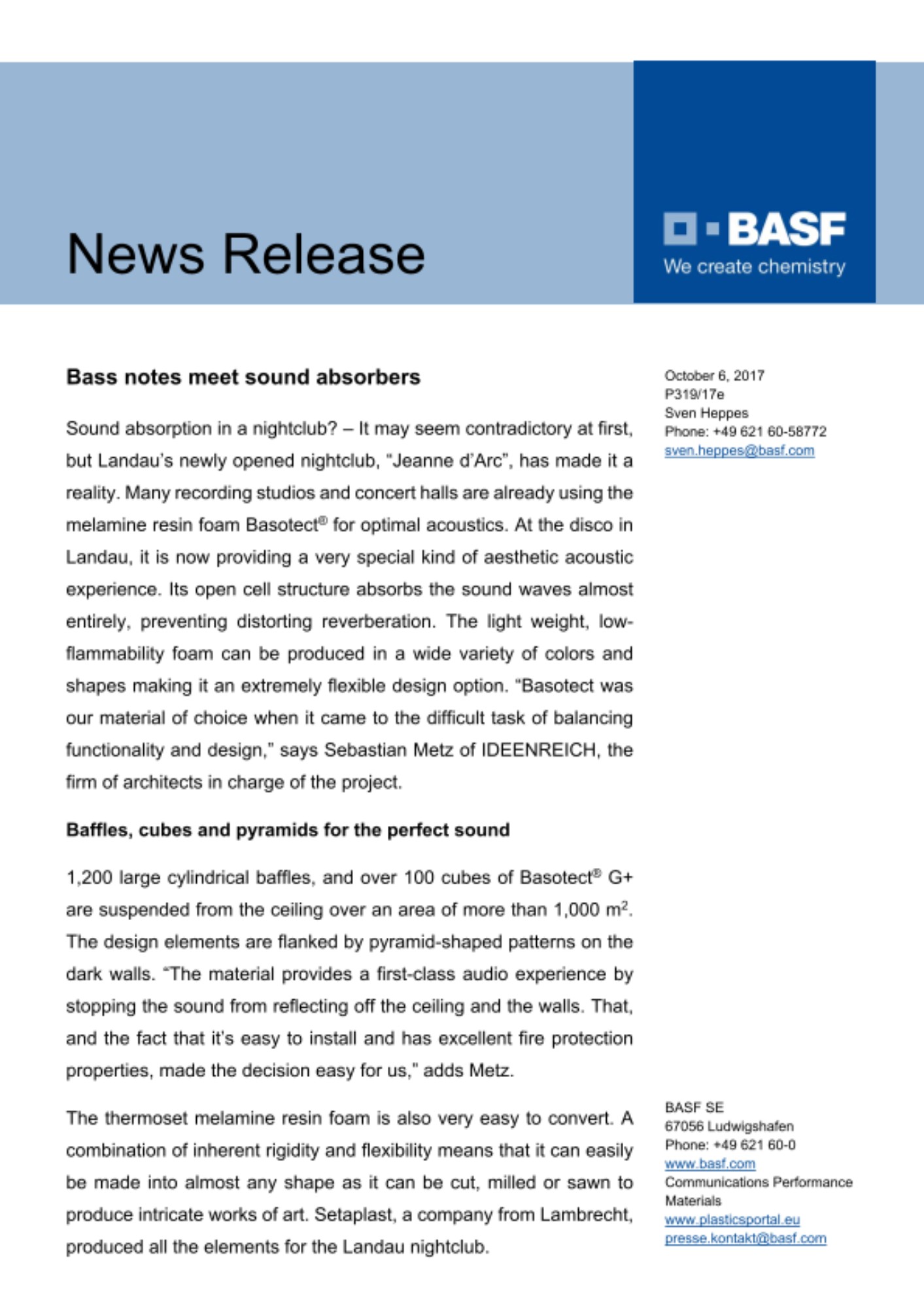 Sound absorption in a nightclub? – It may seem contradictory at first, but Landau’s newly opened nightclub, “Jeanne d’Arc”, has made it a reality. Many recording studios and concert halls are already using the melamine resin foam Basotect® for optimal acoustics. At the disco in Landau, it is now providing a very special kind of aesthetic acoustic experience. Its open cell structure absorbs the sound waves almost entirely, preventing distorting reverberation. The light weight, low-flammability foam can be produced in a wide variety of colors and shapes making it an extremely flexible design option. “Basotect was our material of choice when it came to the difficult task of balancing functionality and design,” says Sebastian Metz of IDEENREICH, the firm of architects in charge of the project.
