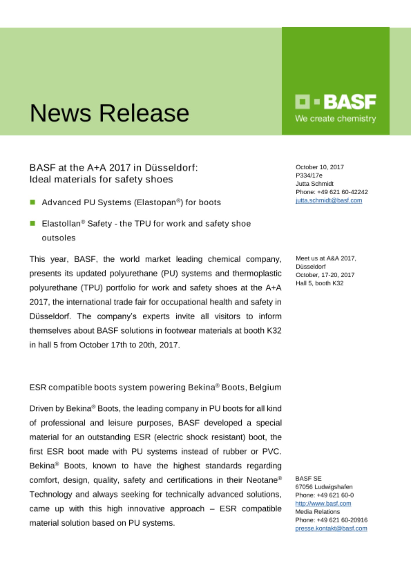 This year, BASF, the world market leading chemical company, presents its updated polyurethane (PU) systems and thermoplastic polyurethane (TPU) portfolio for work and safety shoes at the A+A 2017, the international trade fair for occupational health and safety in Düsseldorf. The company’s experts invite all visitors to inform themselves about BASF solutions in footwear materials at booth K32 in hall 5 from October 17th to 20th, 2017.