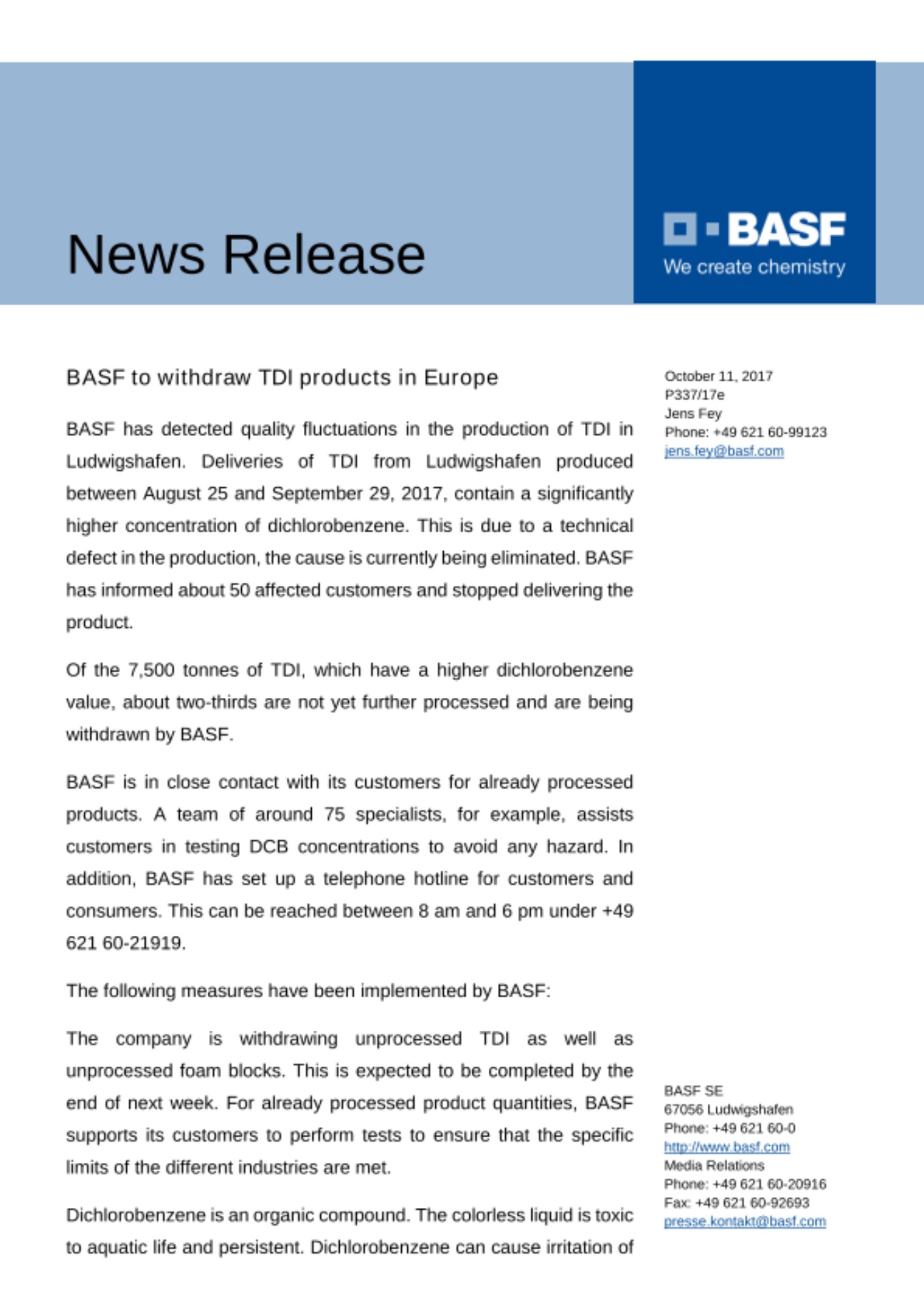 The company is withdrawing unprocessed TDI as well as unprocessed foam blocks. This is expected to be completed by the end of next week. For already processed product quantities, BASF supports its customers to perform tests to ensure that the specific limits of the different industries are met.