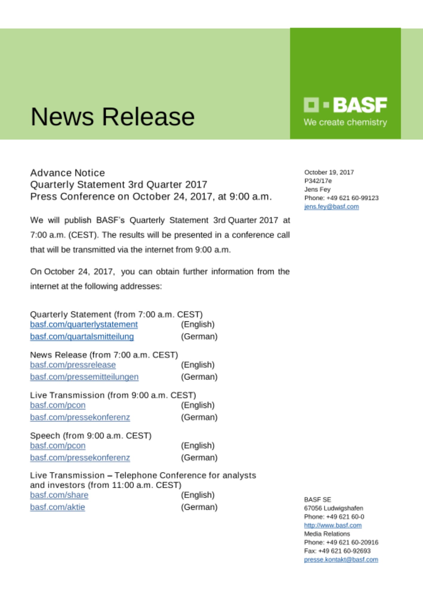 We will publish BASF’s Quarterly Statement 3rd Quarter 2017 at 7:00 a.m. (CEST). The results will be presented in a conference call that will be transmitted via the internet from 9:00 a.m.