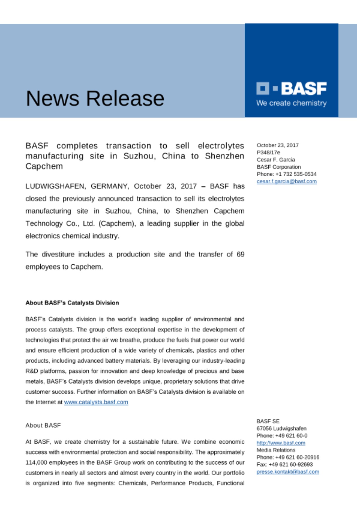 LUDWIGSHAFEN, GERMANY, October 23, 2017 – BASF has closed the previously announced transaction to sell its electrolytes manufacturing site in Suzhou, China, to Shenzhen Capchem Technology Co., Ltd. (Capchem), a leading supplier in the global electronics chemical industry.