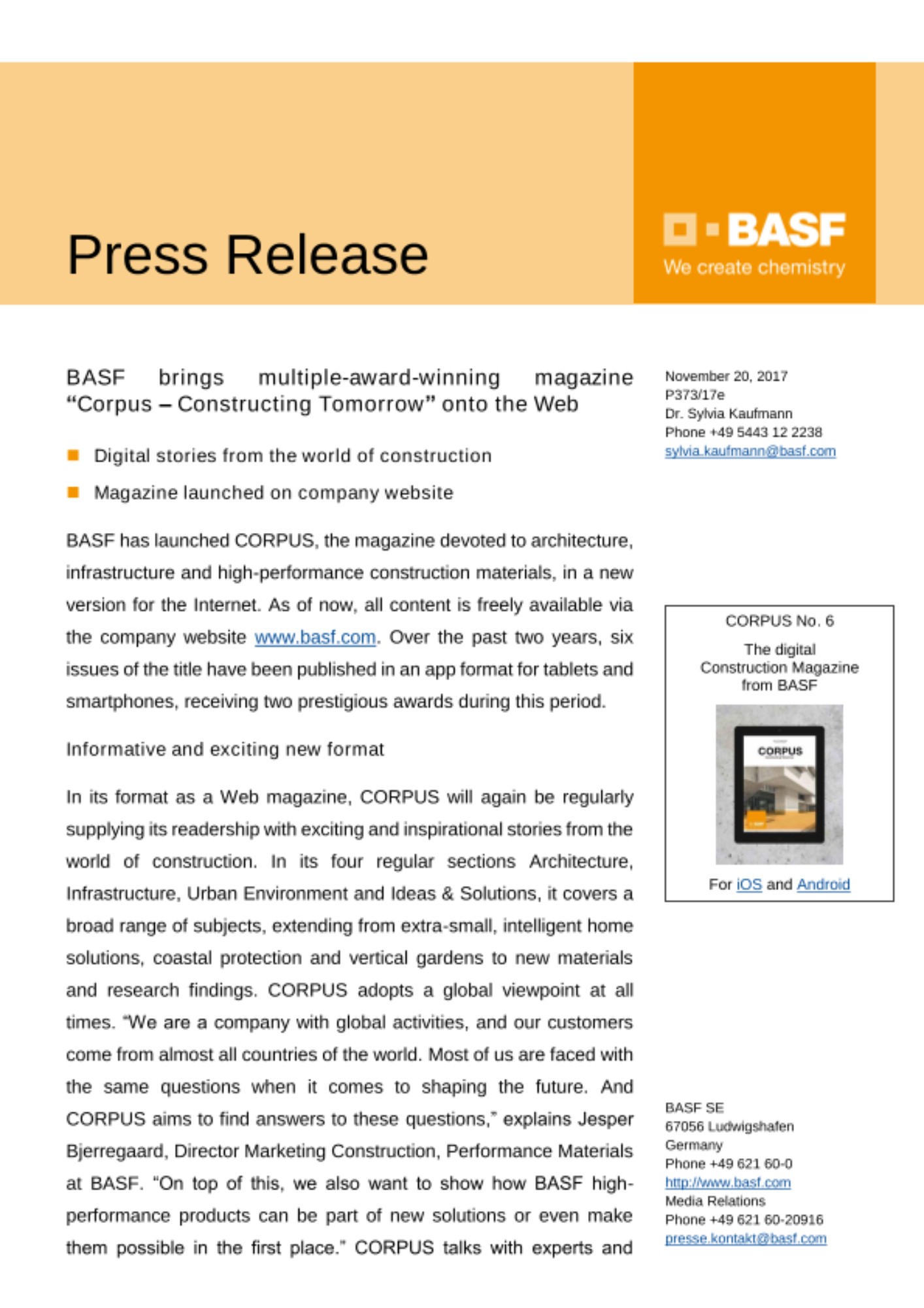 CORPUS can be found at. https://www.basf.com/en/products-and-industries/plastics-rubber/corpus.html. Available in German and English, its content is regularly updated. Visitors can currently read about the new high-performance insulation material SLENTITE® and sustainable architecture concepts for town centers, for example. The app version of the magazine has been commended with the German Design Award in 2016 and with the Best of Content Marketing Award in silver in 2017.