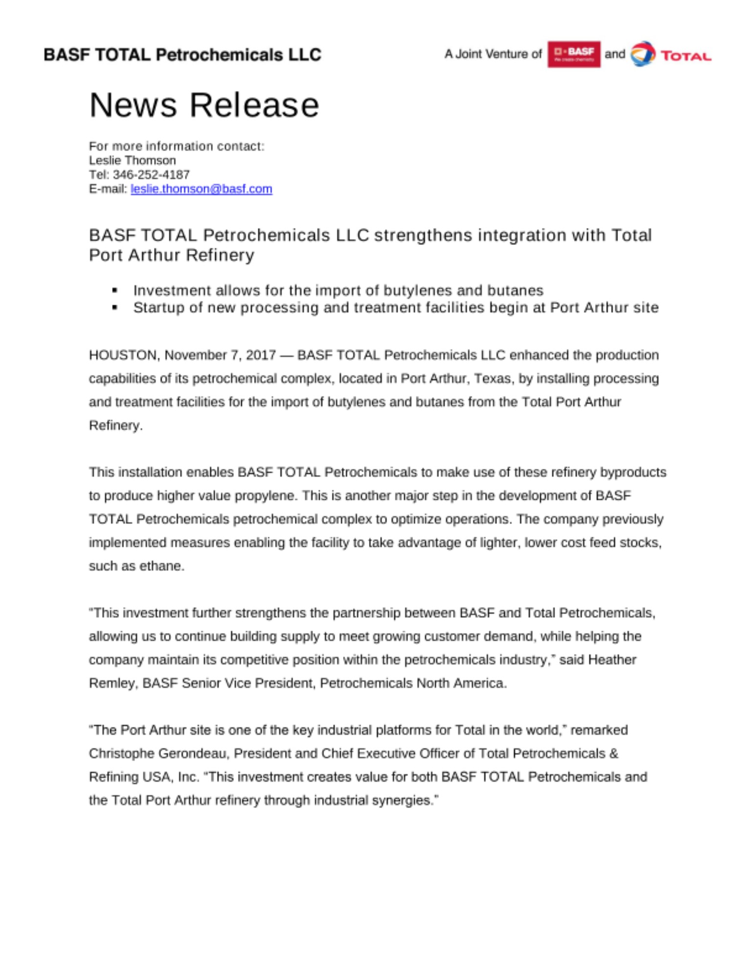 HOUSTON, November 7, 2017 — BASF TOTAL Petrochemicals LLC enhanced the production capabilities of its petrochemical complex, located in Port Arthur, Texas, by installing processing and treatment facilities for the import of butylenes and butanes from the Total Port Arthur Refinery.