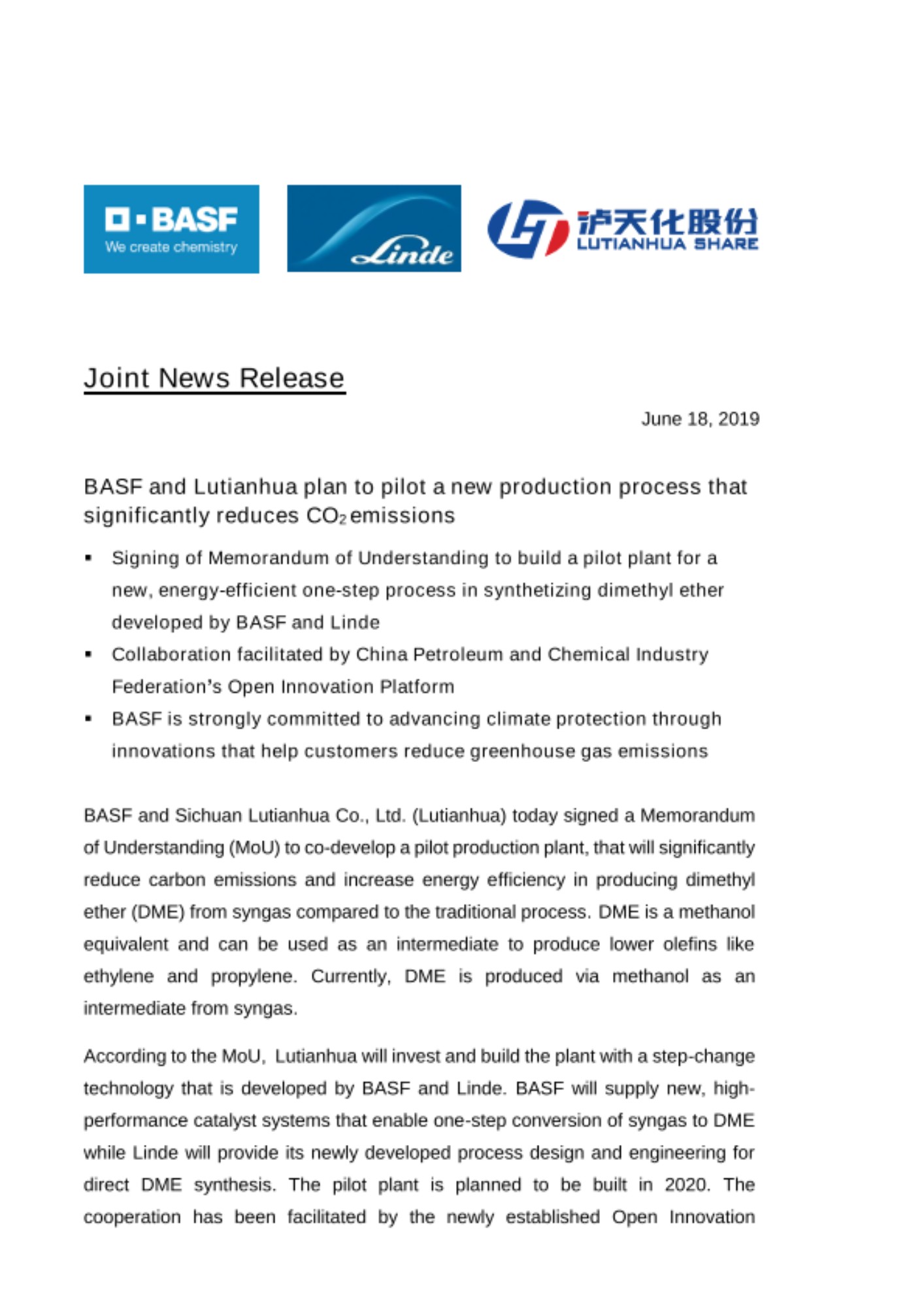 According to the MoU, Lutianhua will invest and build the plant with a step-change technology that is developed by BASF and Linde. BASF will supply new, high-performance catalyst systems that enable one-step conversion of syngas to DME while Linde will provide its newly developed process design and engineering for direct DME synthesis. The pilot plant is planned to be built in 2020. The cooperation has been facilitated by the newly established Open Innovation Platform of China Petroleum and Chemical Industry Federation (CPCIF).