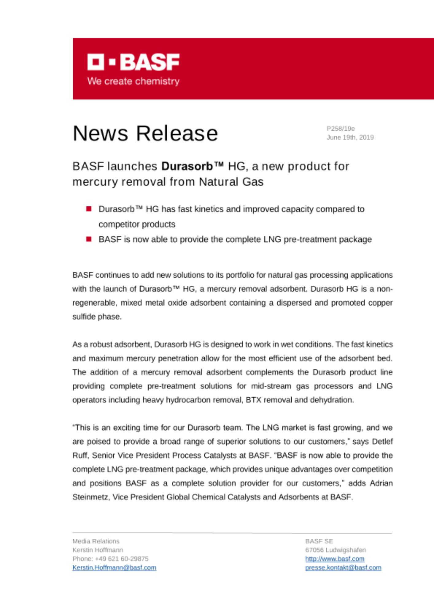 BASF launches Durasorb™ HG, a new product for mercury removal from Natural Gas