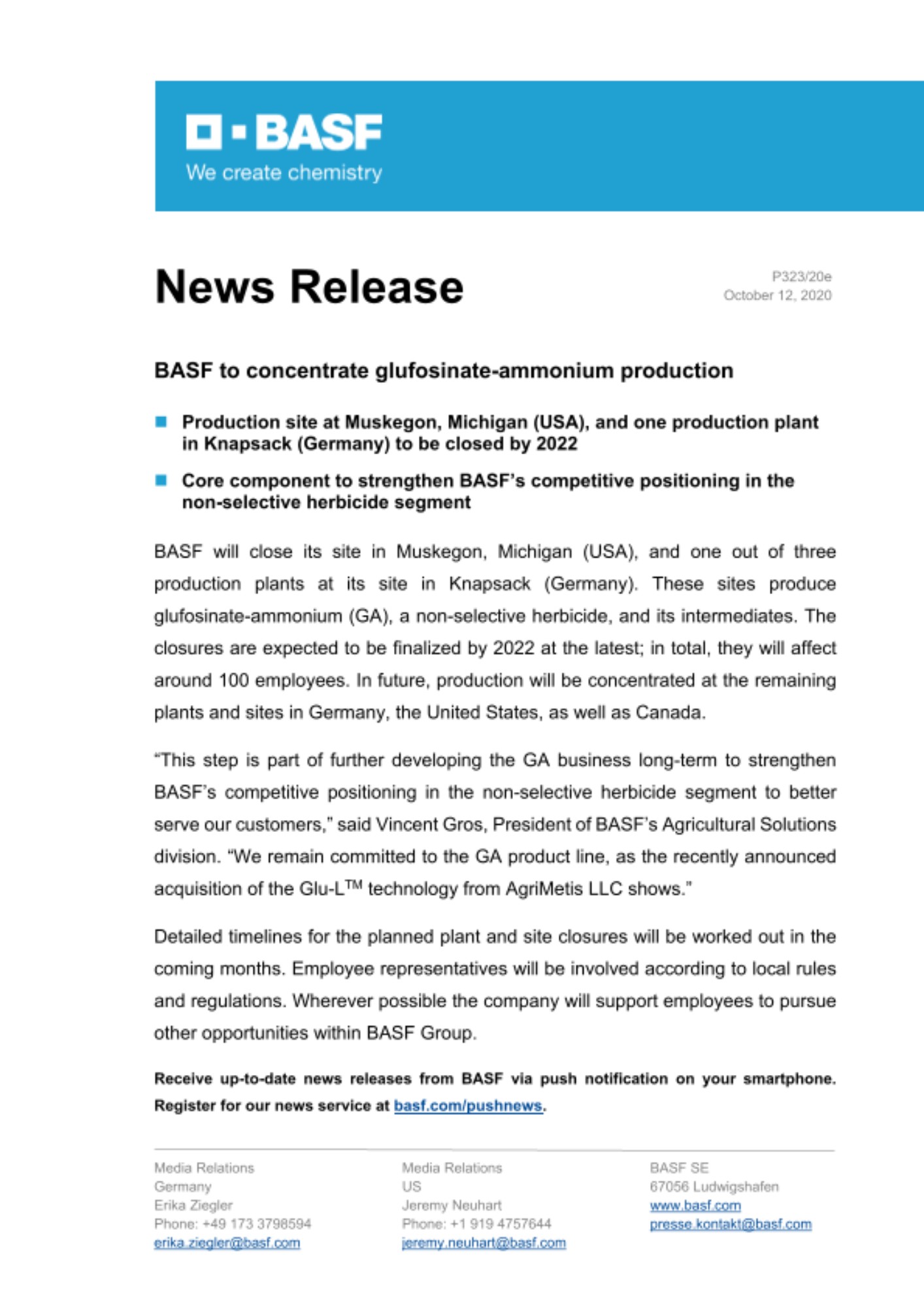Receive up-to-date news releases from BASF via push notification on your smartphone. Register for our news service at basf.com/pushnews.