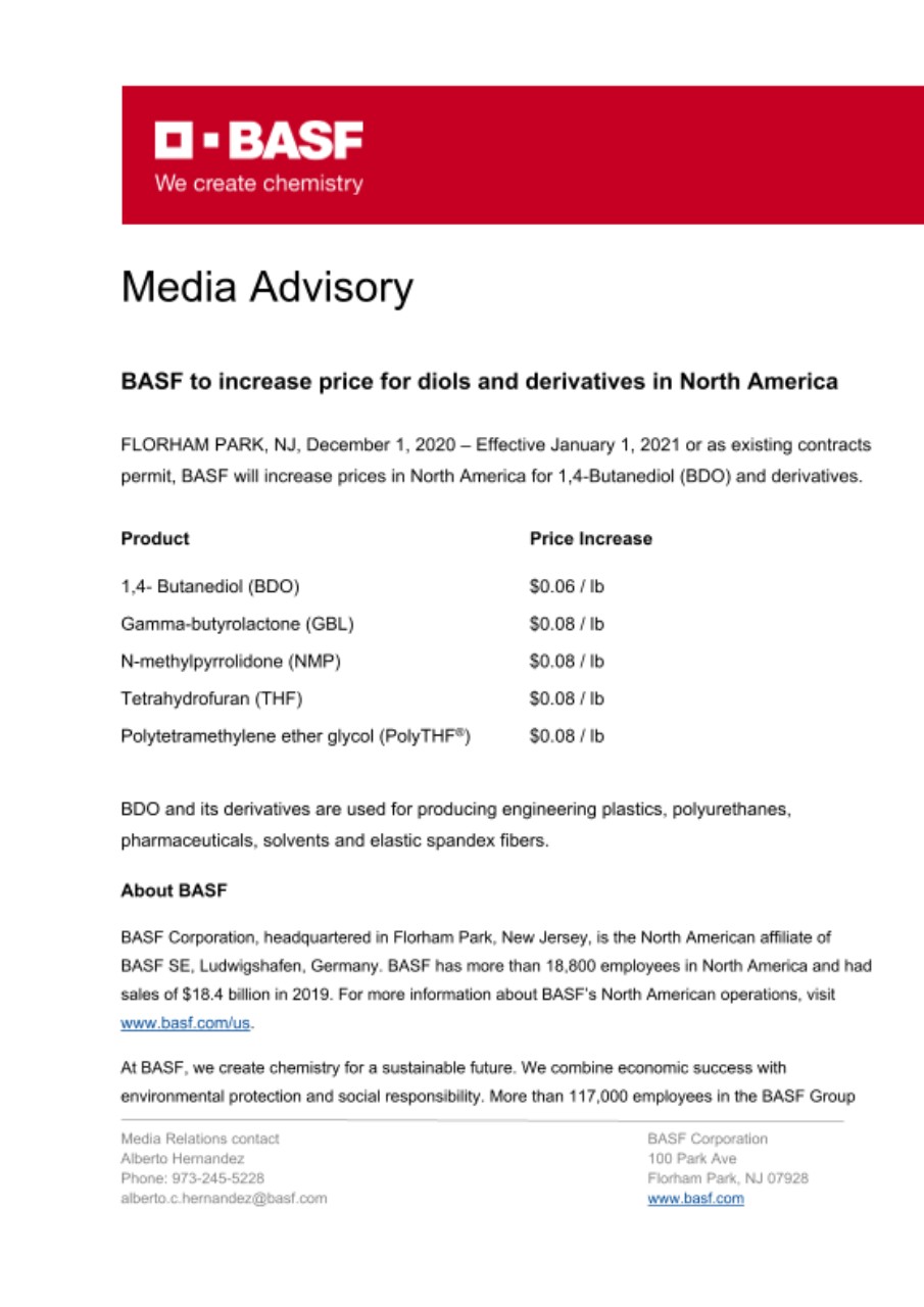 FLORHAM PARK, NJ, December 1, 2020 – Effective January 1, 2021 or as existing contracts permit, BASF will increase prices in North America for 1,4-Butanediol (BDO) and derivatives.