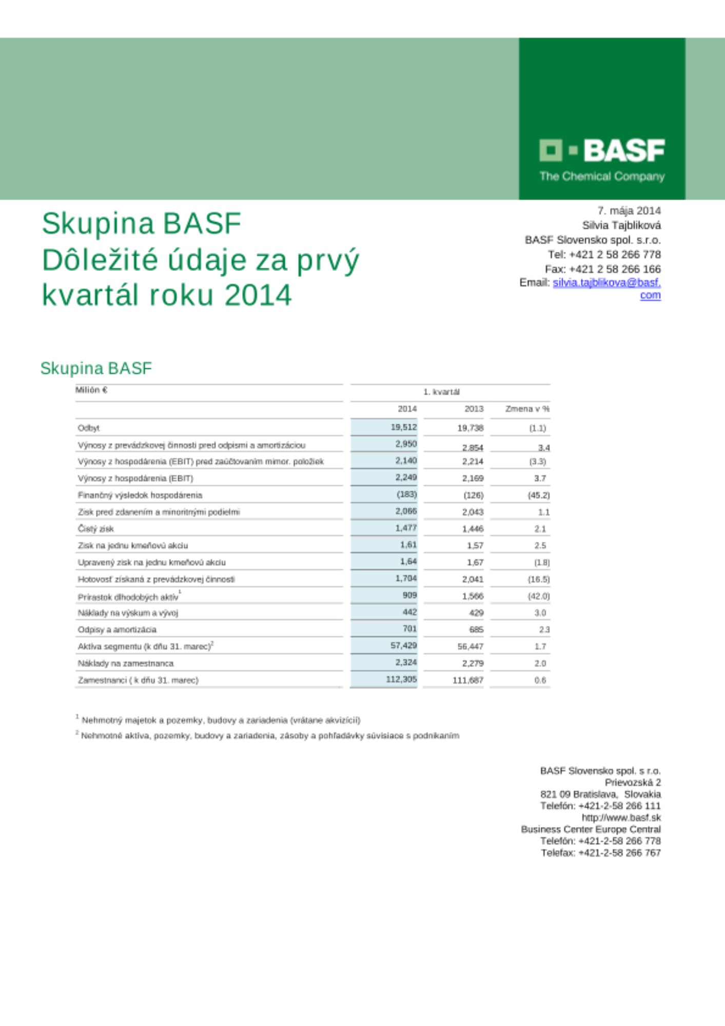 V prvom kvartáli roku 2014 zahrňoval EBIT v mimoriadnych položkách celkom 109 miliónov eur. To je možné z veľkej časti pripísať mimoriadnym príjmom z odpredaja akcií v ropných a plynových poliach v britskej oblasti Severného mora, ktoré spoločnosť BASF neprevádzkuje. EBIT tak medziročne vzrástol o 80 miliónov eur na hodnotu 2,2 miliardy eur. EBITDA vzrástol o 96 miliónov eur na hodnotu 3,0 miliárd eur. Finančný výsledok poklesol o 57 miliónov eur na mínus 183 miliónov eur.