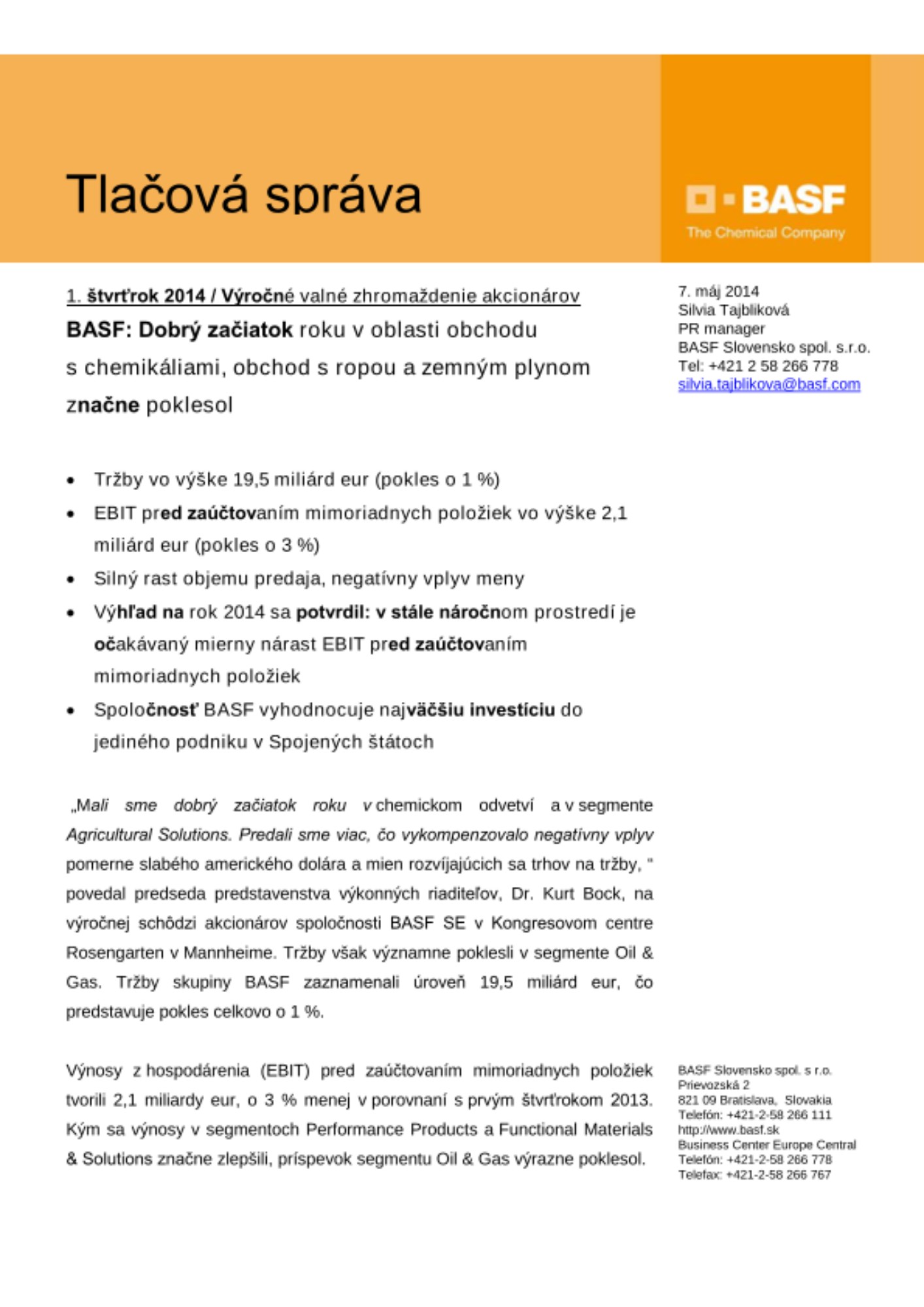 „Mali sme dobrý začiatok roku v chemickom odvetví a v segmente Agricultural Solutions. Predali sme viac, čo vykompenzovalo negatívny vplyv pomerne slabého amerického dolára a mien rozvíjajúcich sa trhov na tržby, “ povedal predseda predstavenstva výkonných riaditeľov, Dr. Kurt Bock, na výročnej schôdzi akcionárov spoločnosti BASF SE v Kongresovom centre Rosengarten v Mannheime. Tržby však významne poklesli v segmente Oil & Gas. Tržby skupiny BASF zaznamenali úroveň 19,5 miliárd eur, čo predstavuje pokles celkovo o 1 %.