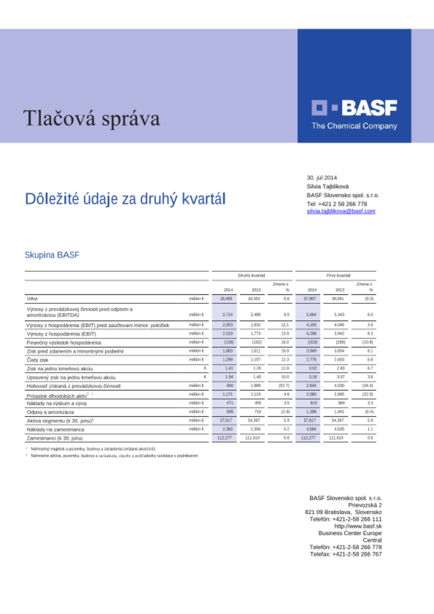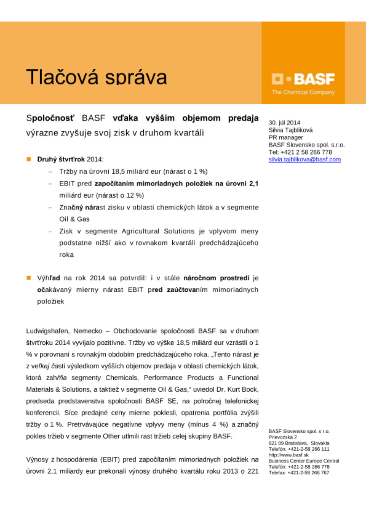 Ludwigshafen, Nemecko – Obchodovanie spoločnosti BASF sa v druhom štvrťroku 2014 vyvíjalo pozitívne. Tržby vo výške 18,5 miliárd eur vzrástli o 1 % v porovnaní s rovnakým obdobím predchádzajúceho roka. „Tento nárast je z veľkej časti výsledkom vyšších objemov predaja v oblasti chemických látok, ktorá zahŕňa segmenty Chemicals, Performance Products a Functional Materials & Solutions, a taktiež v segmente Oil & Gas,“ uviedol Dr. Kurt Bock, predseda predstavenstva spoločnosti BASF SE, na polročnej telefonickej konferencii. Síce predajné ceny mierne poklesli, opatrenia portfólia zvýšili tržby o 1 %. Pretrvávajúce negatívne vplyvy meny (mínus 4 %) a značný pokles tržieb v segmente Other utlmili rast tržieb celej skupiny BASF.