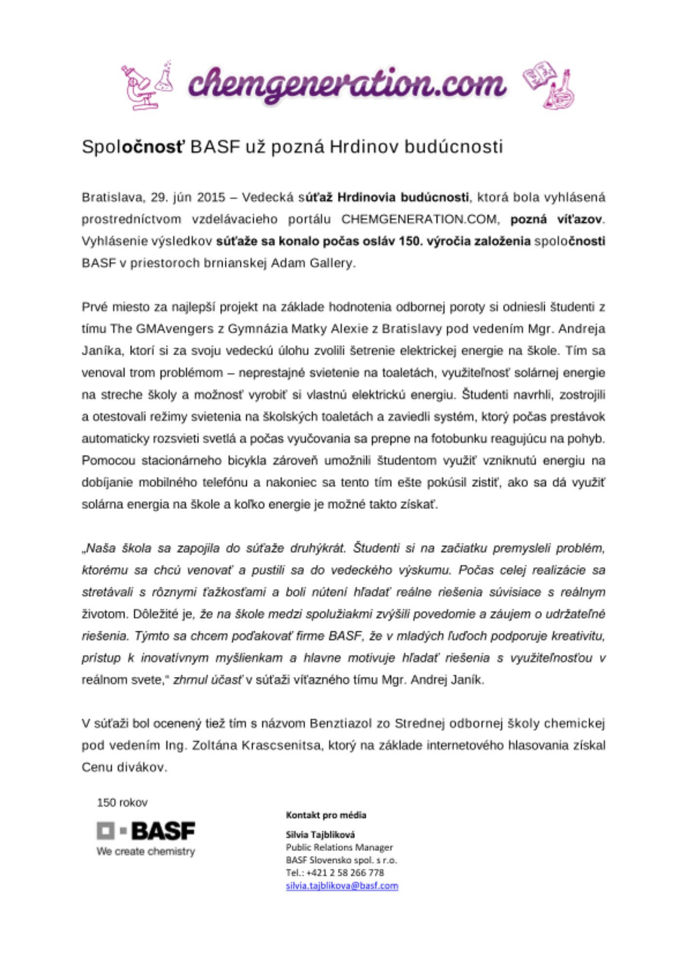Bratislava, 29. jún 2015 – Vedecká súťaž Hrdinovia budúcnosti, ktorá bola vyhlásená prostredníctvom vzdelávacieho portálu CHEMGENERATION.COM, pozná víťazov. Vyhlásenie výsledkov súťaže sa konalo počas osláv 150. výročia založenia spoločnosti BASF v priestoroch brnianskej Adam Gallery.