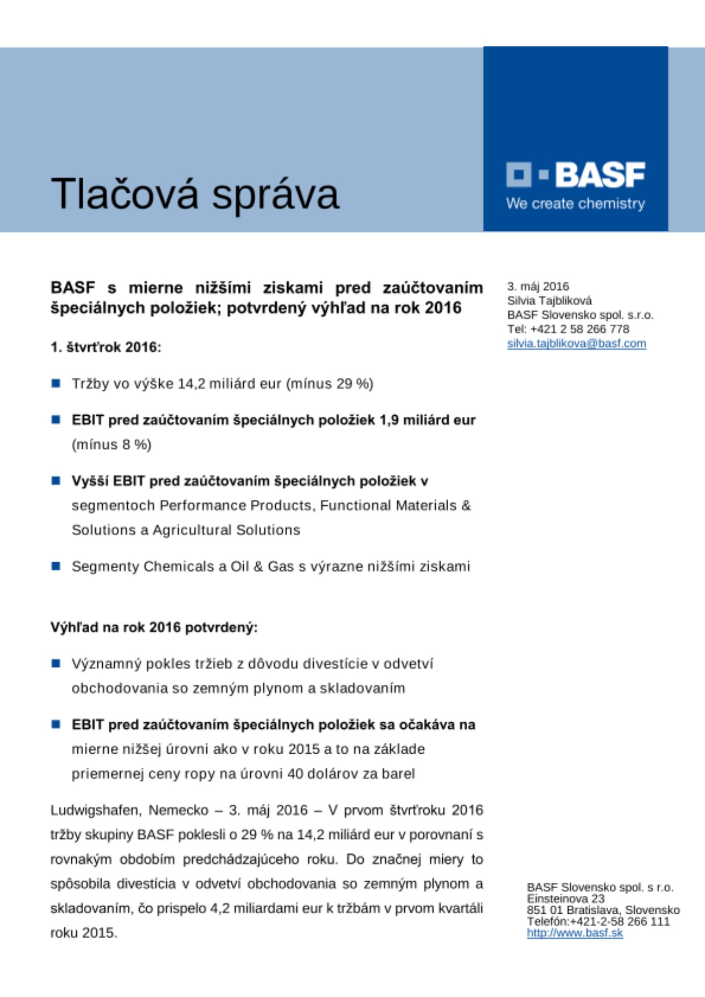 Ludwigshafen, Nemecko – 3. máj 2016 – V prvom štvrťroku 2016 tržby skupiny BASF poklesli o 29 % na 14,2 miliárd eur v porovnaní s rovnakým obdobím predchádzajúceho roku. Do značnej miery to spôsobila divestícia v odvetví obchodovania so zemným plynom a skladovaním, čo prispelo 4,2 miliardami eur k tržbám v prvom kvartáli roku 2015.