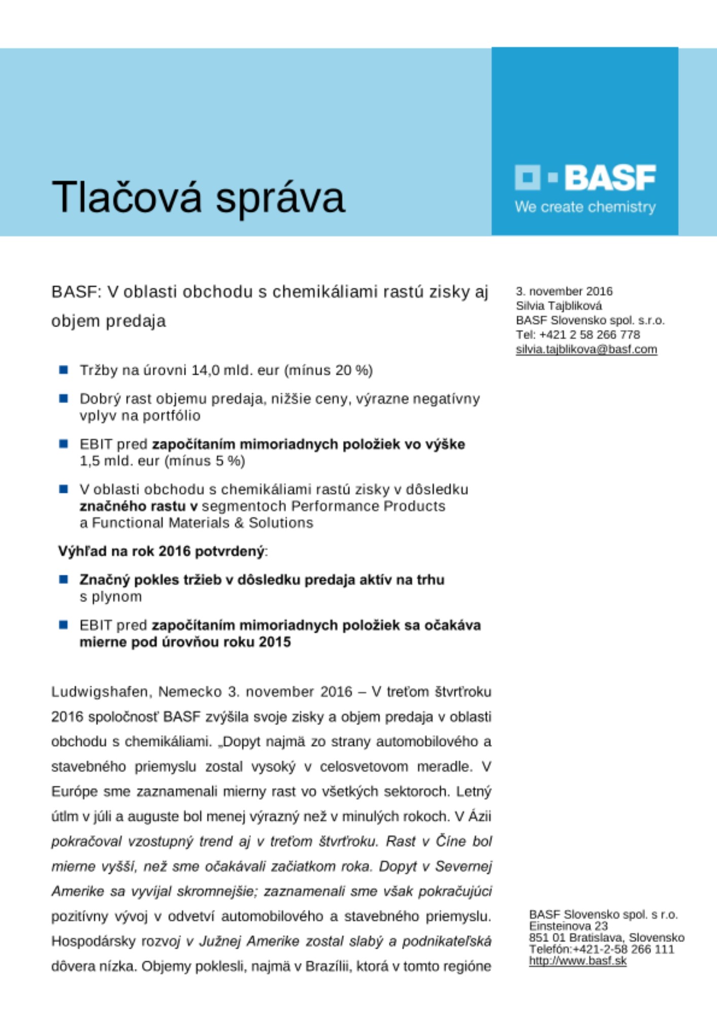 Ludwigshafen, Nemecko 3. november 2016 – V treťom štvrťroku 2016 spoločnosť BASF zvýšila svoje zisky a objem predaja v oblasti obchodu s chemikáliami. „Dopyt najmä zo strany automobilového a stavebného priemyslu zostal vysoký v celosvetovom meradle. V Európe sme zaznamenali mierny rast vo všetkých sektoroch. Letný útlm v júli a auguste bol menej výrazný než v minulých rokoch. V Ázii pokračoval vzostupný trend aj v treťom štvrťroku. Rast v Číne bol mierne vyšší, než sme očakávali začiatkom roka. Dopyt v Severnej Amerike sa vyvíjal skromnejšie; zaznamenali sme však pokračujúci pozitívny vývoj v odvetví automobilového a stavebného priemyslu. Hospodársky rozvoj v Južnej Amerike zostal slabý a podnikateľská dôvera nízka. Objemy poklesli, najmä v Brazílii, ktorá v tomto regióne predstavuje náš najväčší trh,“ uviedol Hans-Ulrich Engel, finančný riaditeľ spoločnosti BASF SE.