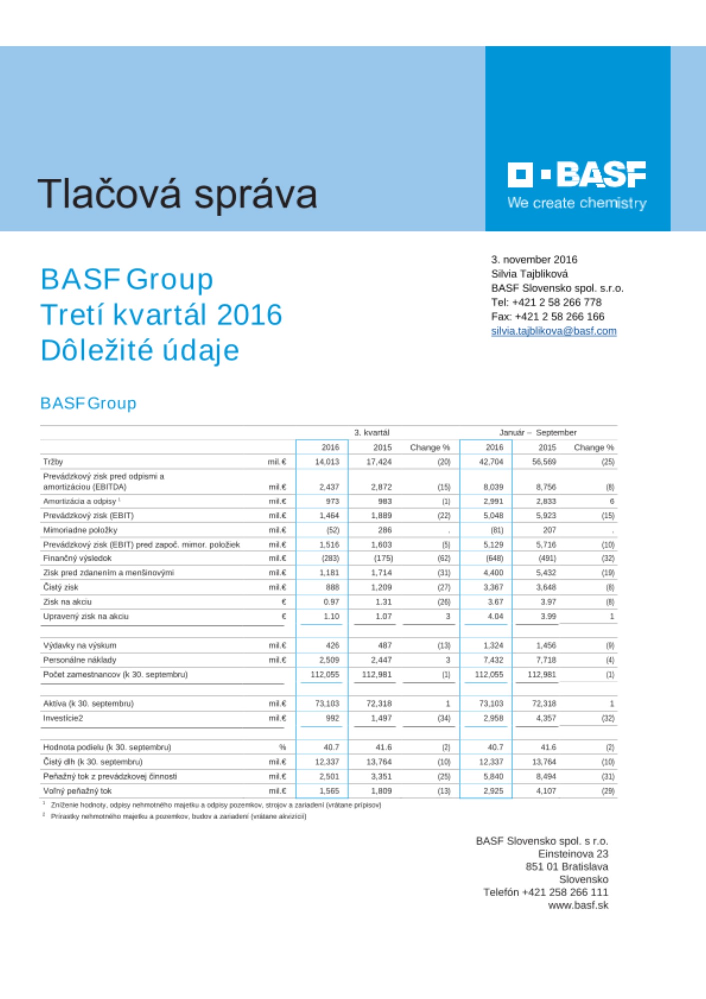 Tržby koncernu BASF Group v treťom štvrťroku 2016 klesli o 20 % na 14,0 miliardy eur, najmä v dôsledku predaja aktív na trhu s plynom a aktivít súvisiacich s jeho uskladnením v rámci výmeny aktív so spoločnosťou Gazprom na konci septembra 2015. Tento obchod prispel k tržbám v treťom štvrťroku 2015 sumou 2,9 miliardy eur. Vplyv na portfólio bol v úhrne zodpovedný za pokles tržieb vo výške 18 percentuálnych bodov. Navyše predajné ceny boli nižšie (o 5 %) z dôvodu nižších cien surovín. K nárastu objemu (o 4 %) prispeli v prvom rade segmenty Functional Materials & Solutions a Chemicals.
