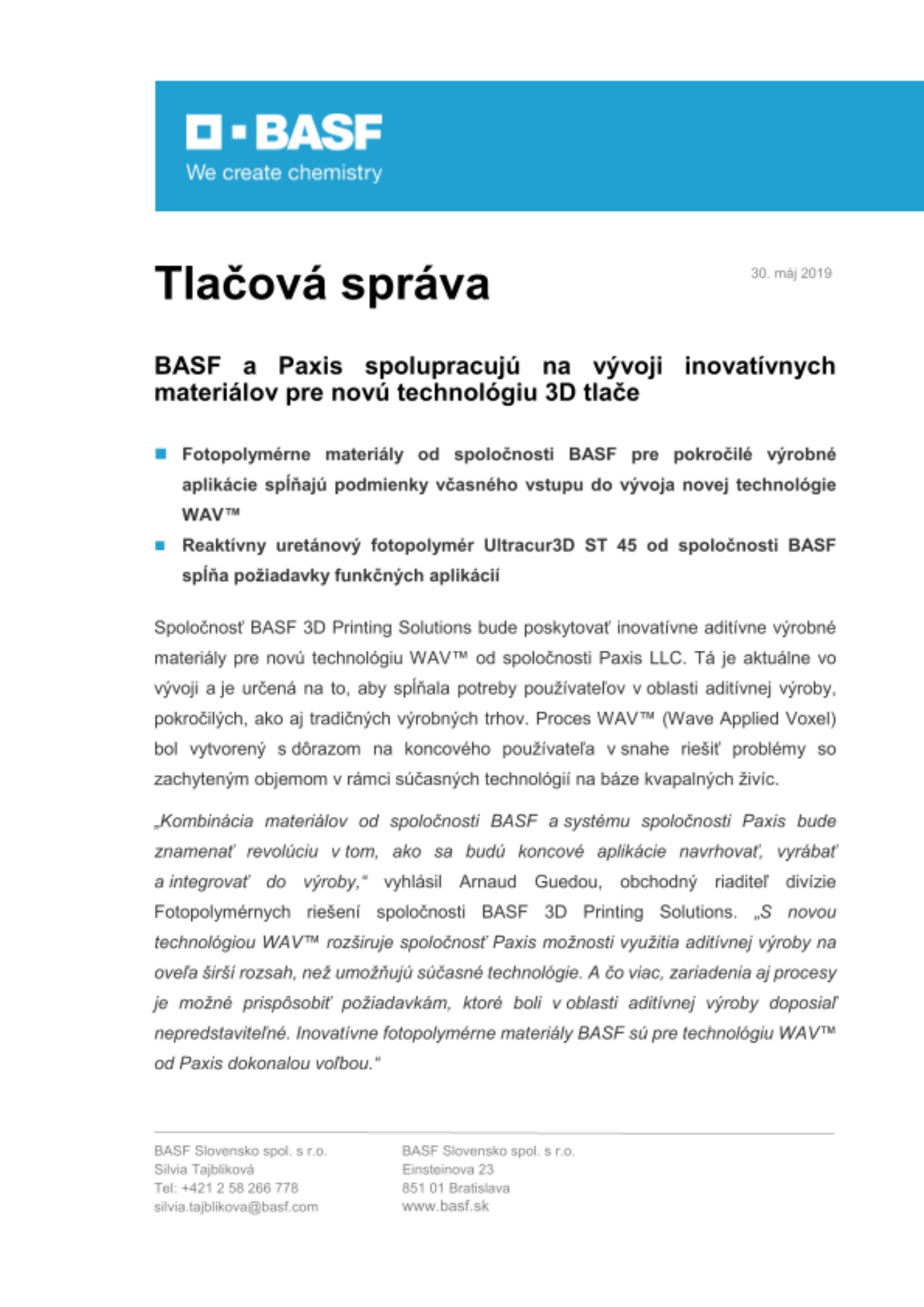 Spoločnosť BASF 3D Printing Solutions bude poskytovať inovatívne aditívne výrobné materiály pre novú technológiu WAV™ od spoločnosti Paxis LLC. Tá je aktuálne vo vývoji a je určená na to, aby spĺňala potreby používateľov v oblasti aditívnej výroby, pokročilých, ako aj tradičných výrobných trhov. Proces WAV™ (Wave Applied Voxel) bol vytvorený s dôrazom na koncového používateľa v snahe riešiť problémy so zachyteným objemom v rámci súčasných technológií na báze kvapalných živíc.