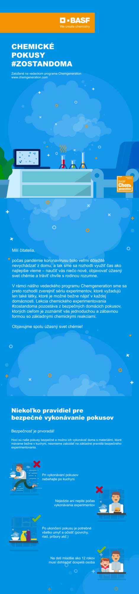 V rámci nášho vedeckého programu Chemgeneration sme sa preto rozhodli zverejniť sériu experimentov, ktoré vyžadujú len také látky, ktoré je možné bežne nájsť v každej domácnosti. Lekcia chemického experimentovania #zostandoma pozostáva z bezpečných domácich pokusov, ktorých cieľom je zoznámiť vás jednoduchou a zábavnou formou so základnými chemickými reakciami.
